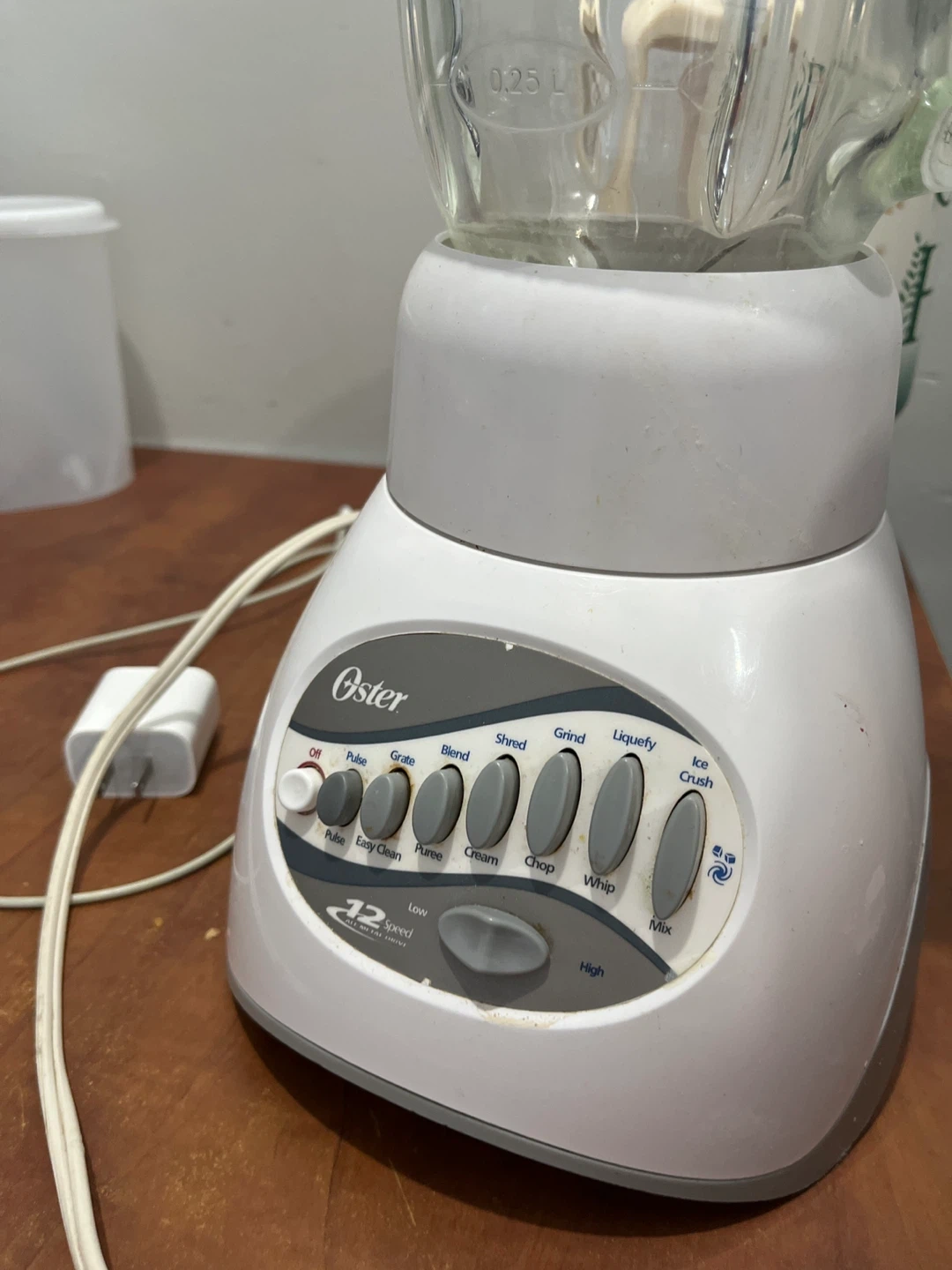 White Oster 12-speed blender with a glass pitcher. Features multiple blending settings including Liquefy, Blend, and Ice Crush. 12 speed settings available for versatile use.