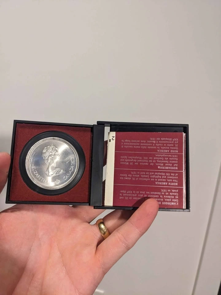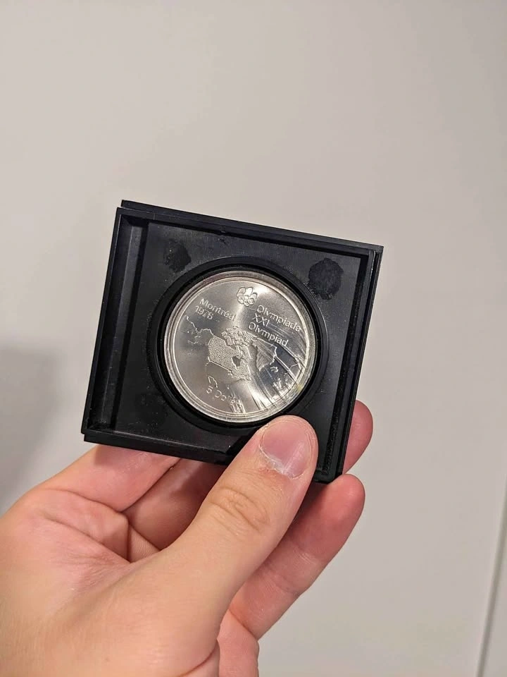 Vintage 1976 Montreal Olympics commemorative silver coin produced by the Royal Canadian Mint. Diameter: 38mm. Weight: .723 Troy Ounce. Content: 92.5% Pure Silver. Still in original casing. Let me know if you're interested!