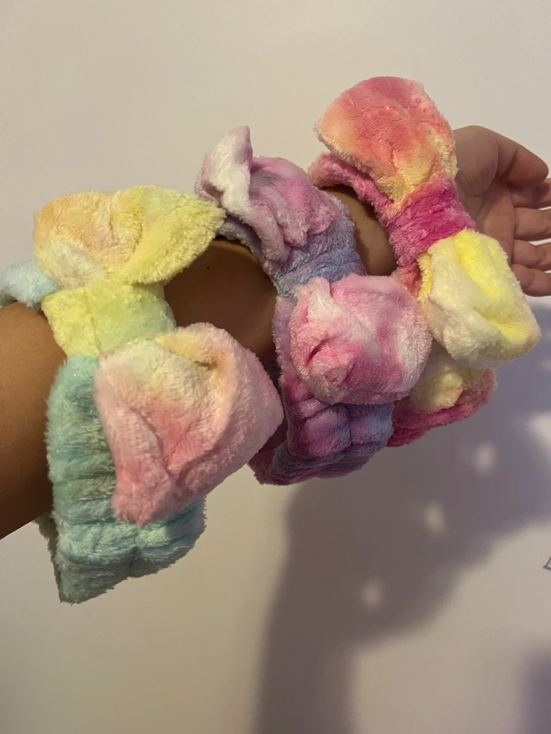 Four fuzzy tie-dye headbands with bow details. They're made of a soft, plush material in pastel rainbow colours. Great for keeping hair back during skincare routines or makeup application! $3 each
