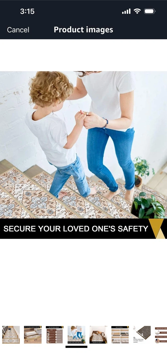 These HEBE new stair treads are designed for wooden stairs and feature a self-adhesive backing for easy installation. They're made with durable material and a non-slip surface. This set includes 15 individual stair treads, each measuring 8"x30".