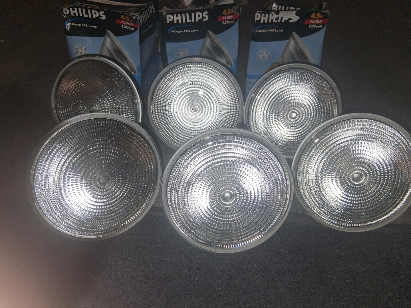 Selling six Philips 45W flood halogen PAR lamps. These bulbs offer 2500 hours of light and are 130-volt. They provide a bright, focused beam for various lighting needs. Suitable for accent lighting or task lighting applications.