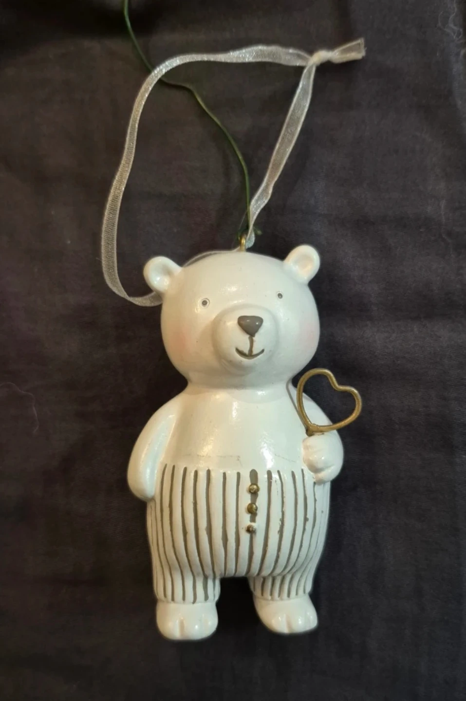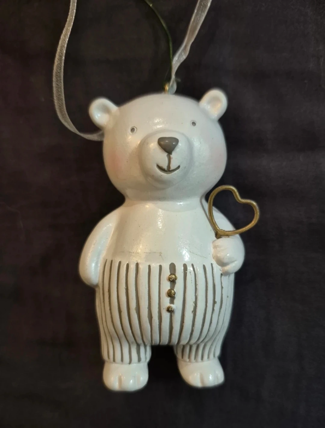 This charming white teddy bear ornament holds a golden heart. It's adorned with pinstripe detailing and tiny buttons on its front. It's ready to add a touch of whimsy to your holiday decor!