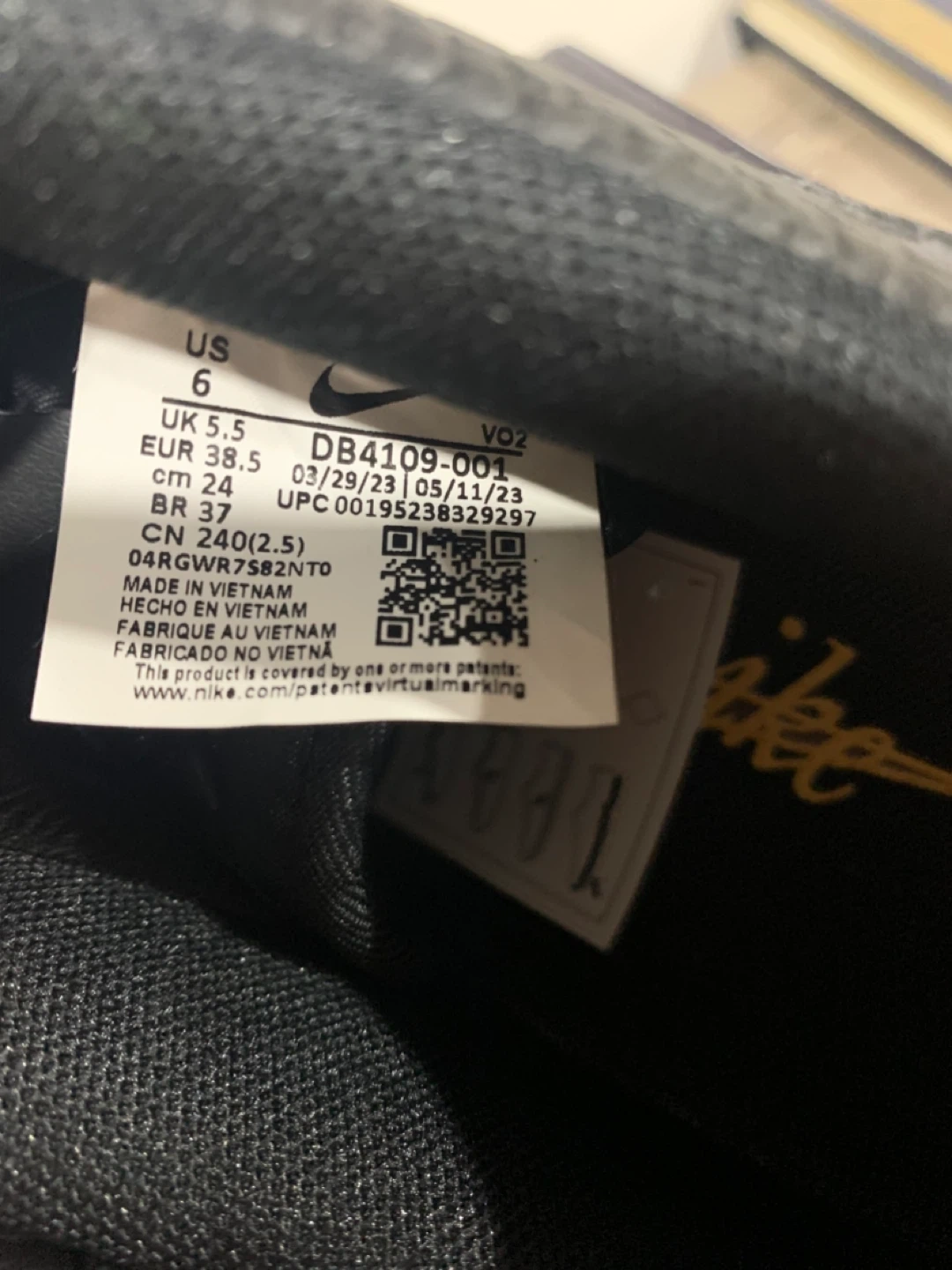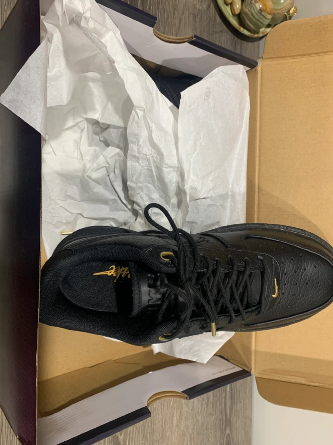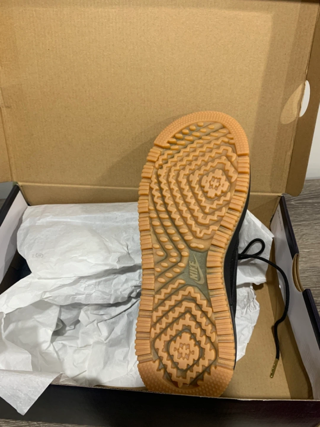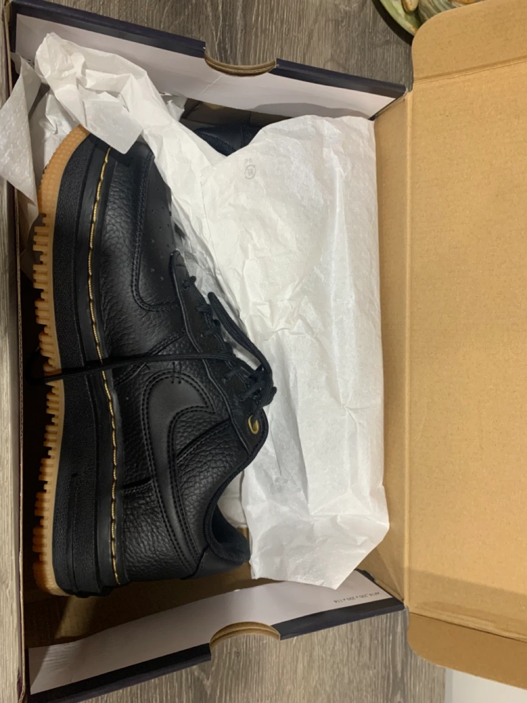 These are a pair of black Nike Air Force 1 Low sneakers with a gum sole. They're a men's US size 6. Includes original box.
