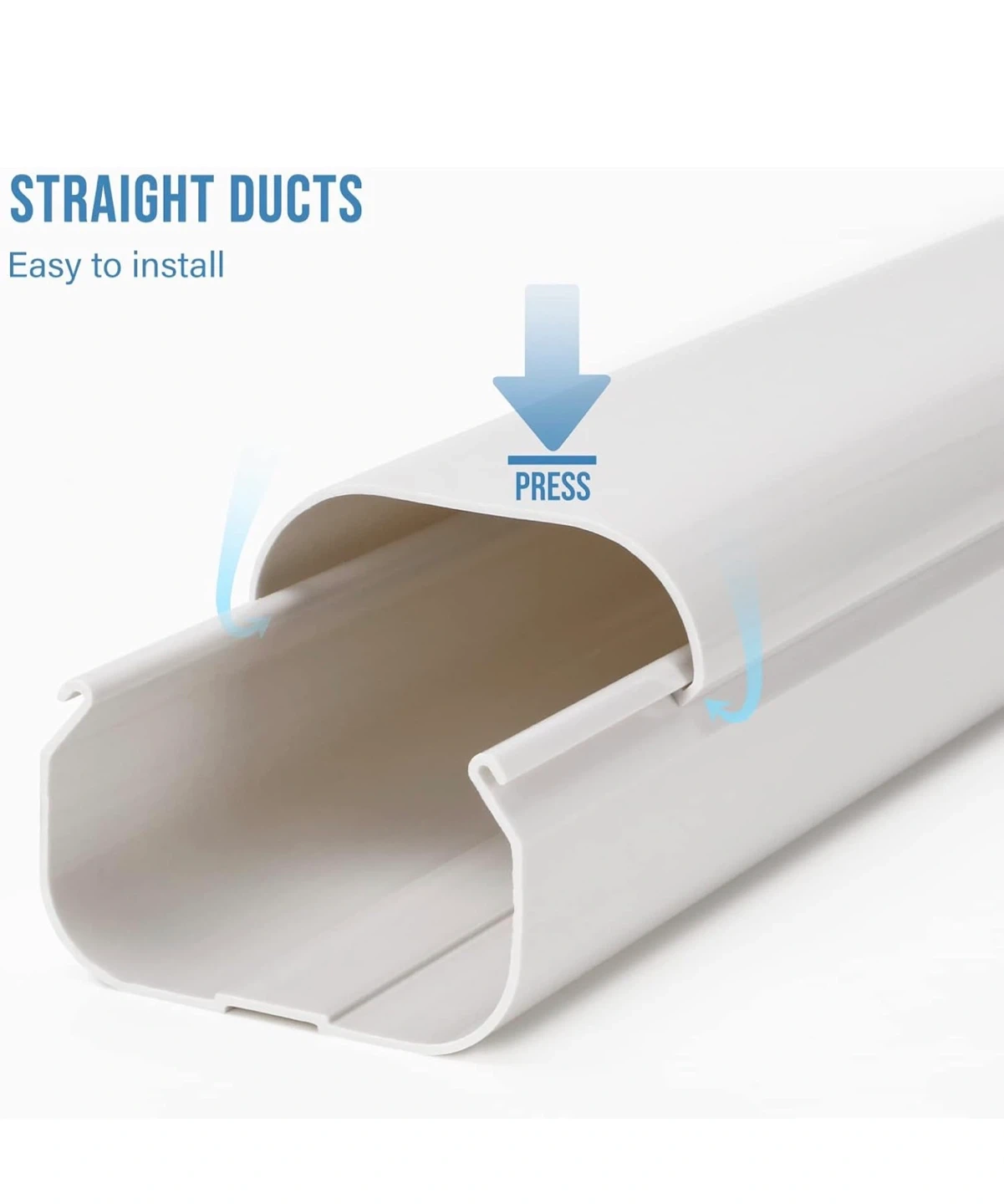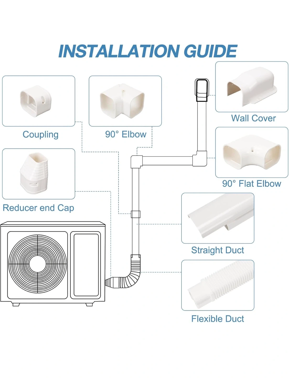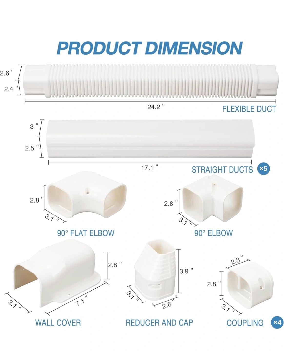 This HOXHA AC line set cover kit includes straight ducts, flexible duct, elbows, couplings, and a wall cover. It's made of white PVC tubing for mini split and central AC systems. The kit offers up to 9ft of coverage for your AC lines.