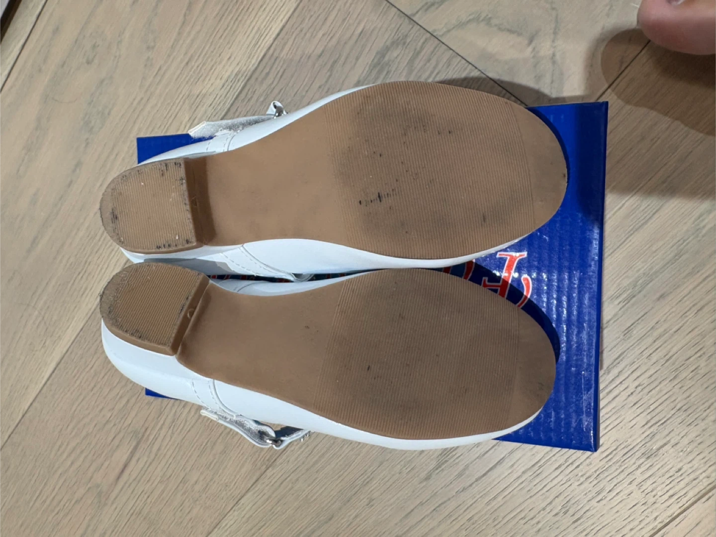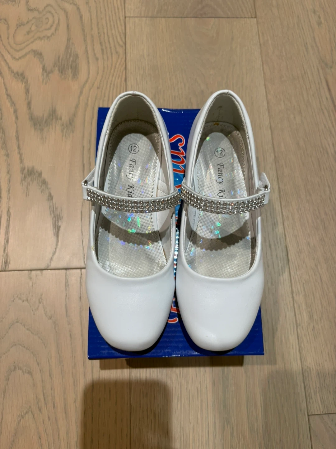These adorable Fancy Kids dress shoes are perfect for your little one! They are white with a sparkly strap and come in size 12. The original box is included and the original price was $57.99. They were used once for a special occasion.