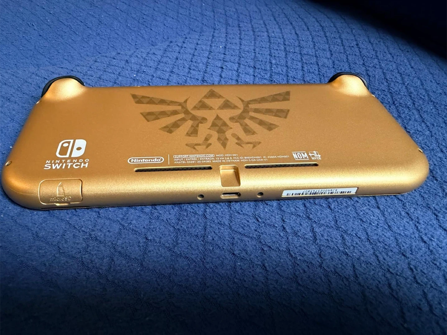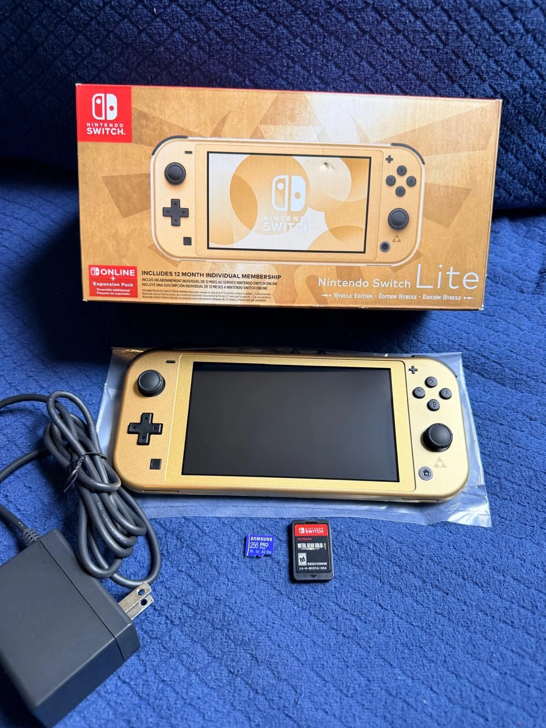 Gold Nintendo Switch Lite console with The Legend of Zelda Triforce design. Includes AC adapter, and a 256gb Samsung memory card. It's the Hyrule Edition! 3 metal gear games Included 1-2-3