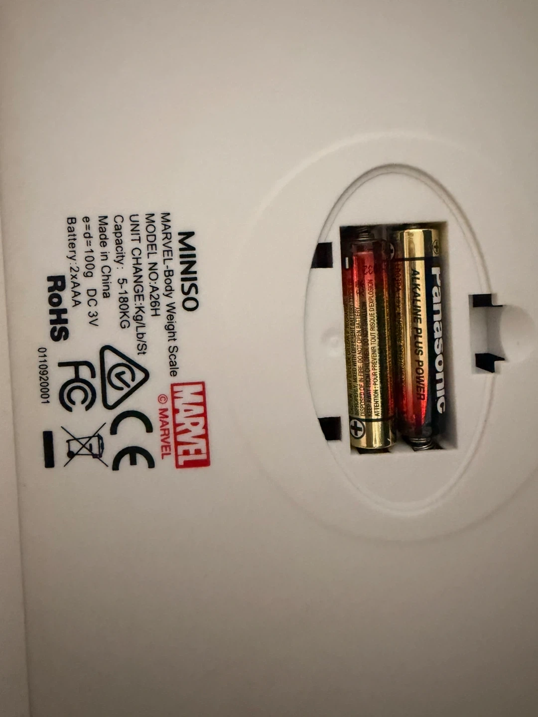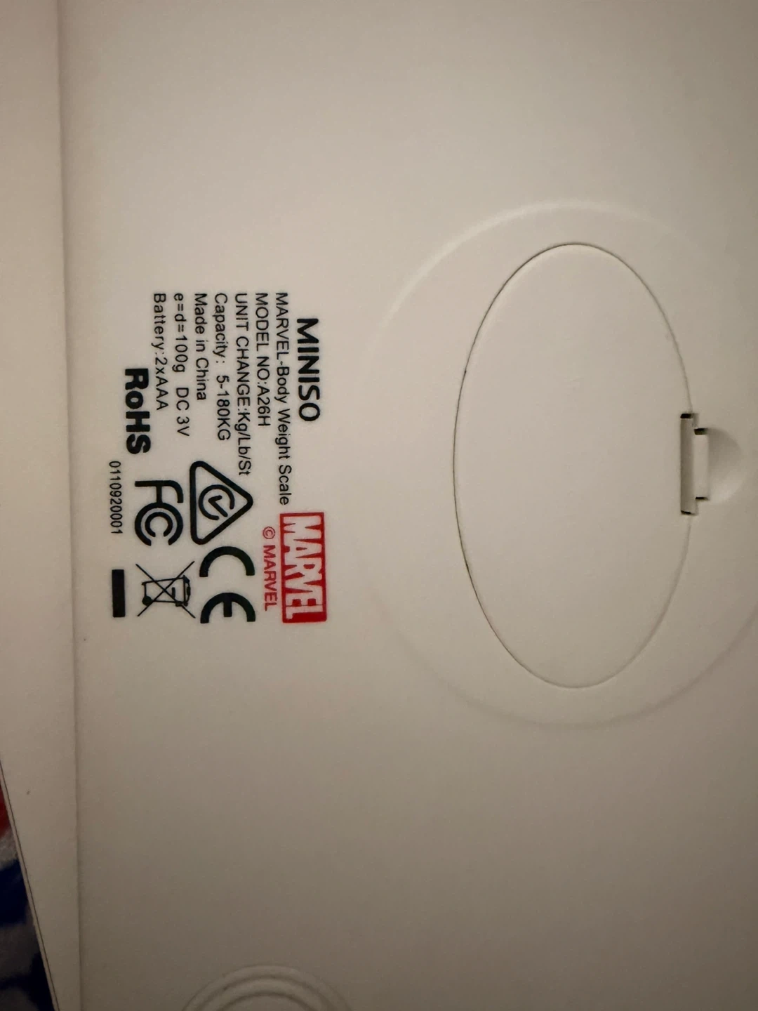 MINISO Marvel body weight scale. Model A26H. Capacity is 5-180KG. Unit change Kg/lb/St. Requires 2xAAA batteries, included. Made in China.