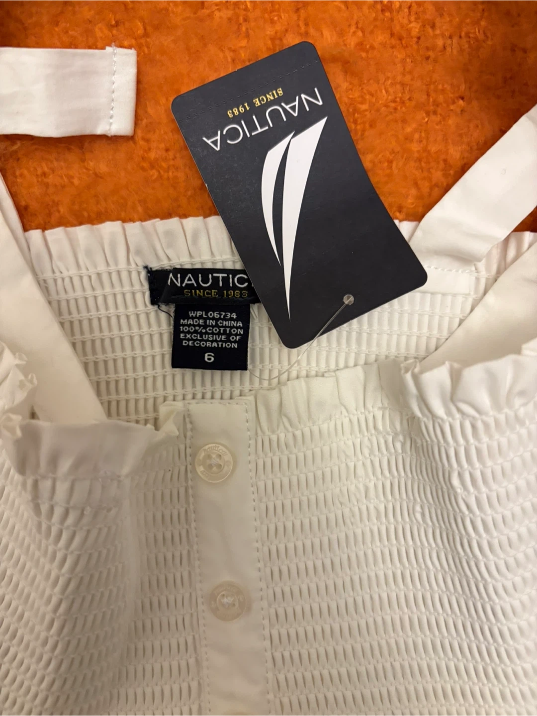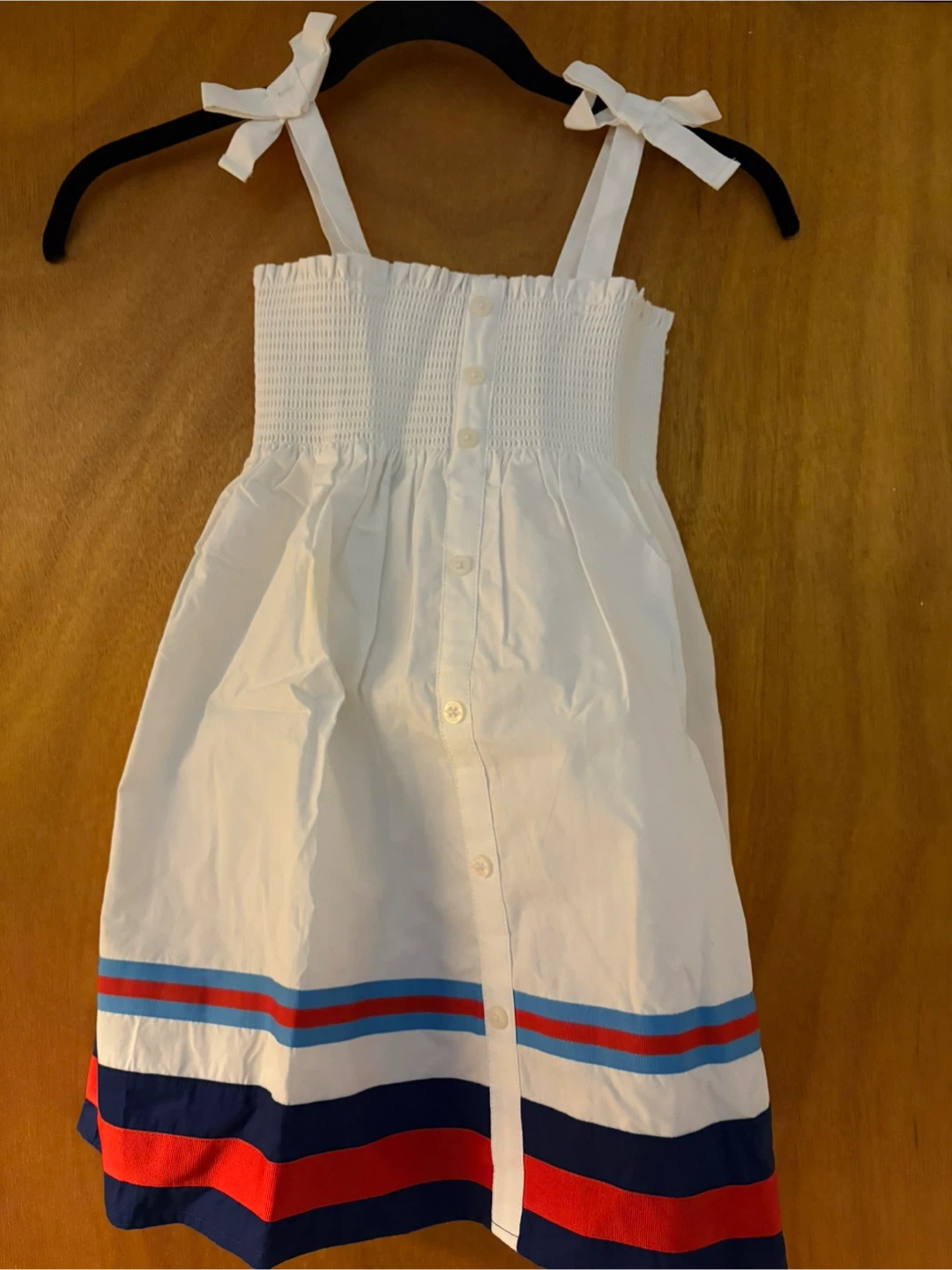 This Nautica sundress is white with a smocked bodice and button front. It features a colorful striped hem. Made of 100% cotton. A great choice for warm weather!