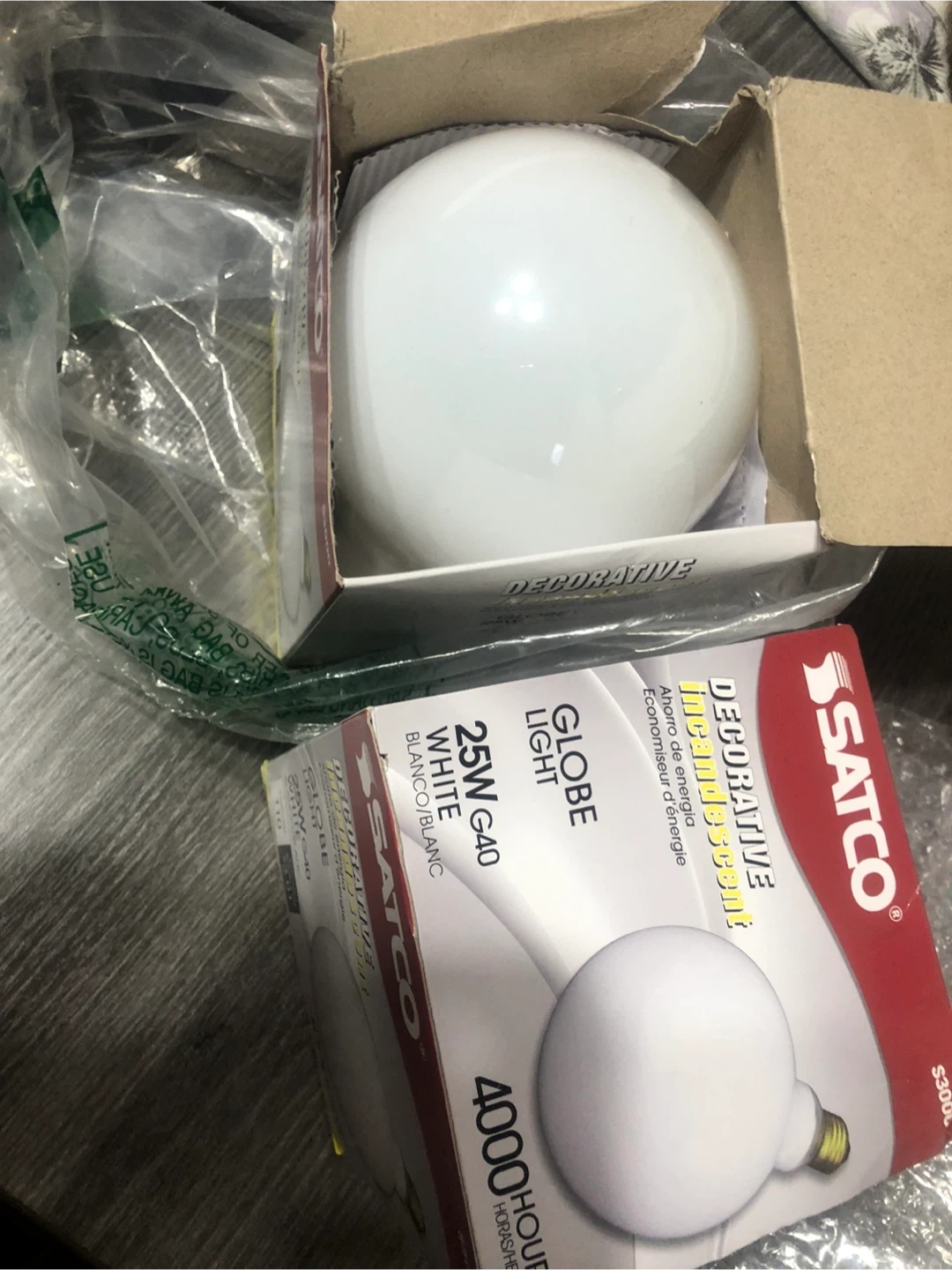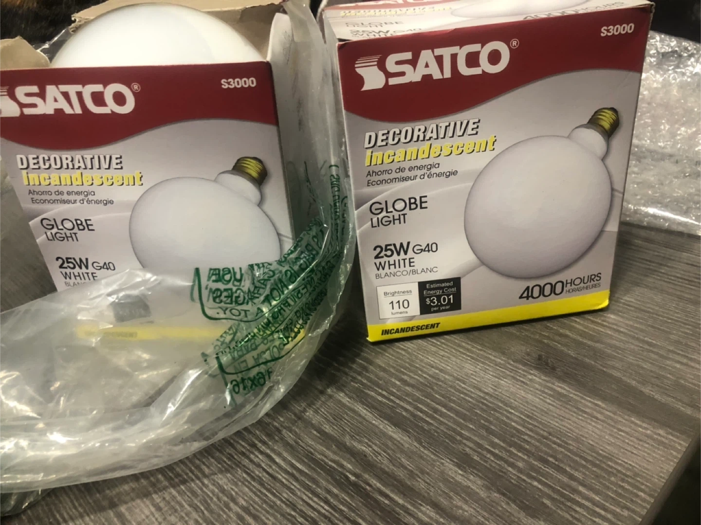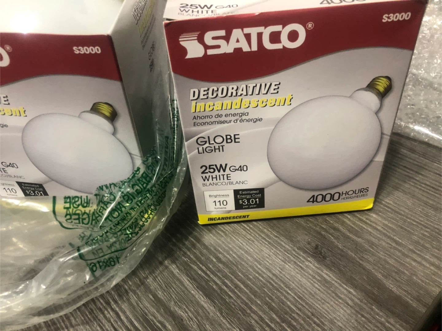 Selling a SATCO G40 globe light bulb in white. It's a decorative incandescent bulb with 4000 hours of light. The box is included!
