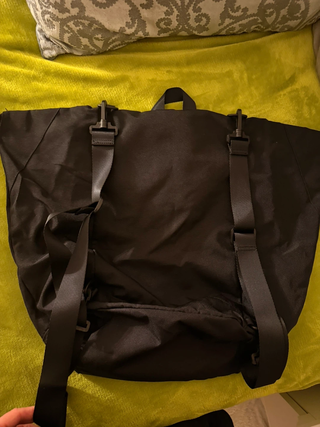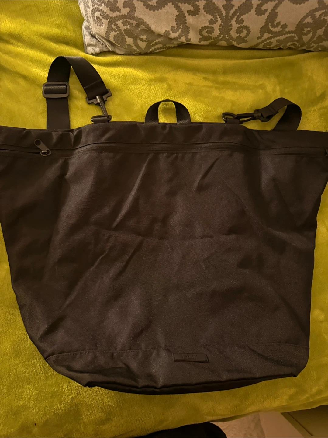 This versatile black bag can be used as a backpack or a tote. It features a spacious main compartment with a zipper closure. Made from durable nylon material.
