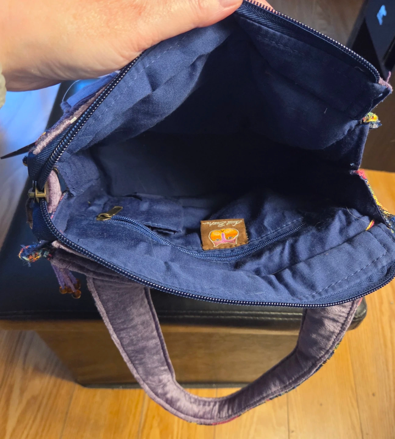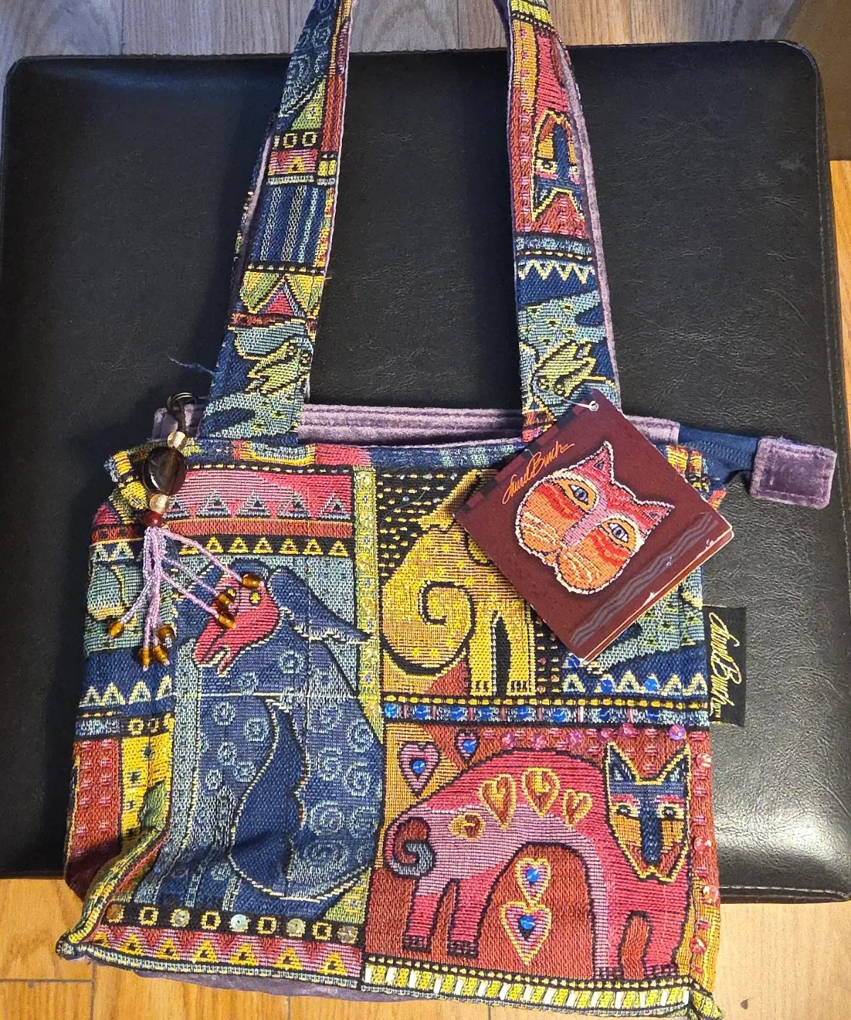 Selling a vibrant Judi Bunch tapestry shoulder bag featuring a whimsical cat design. It has a zippered closure and an interior zippered pocket. Perfect for adding a pop of colour to any outfit!