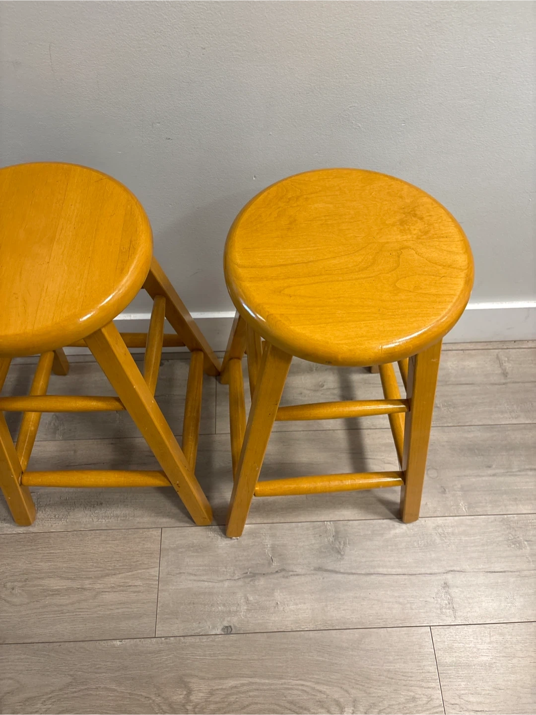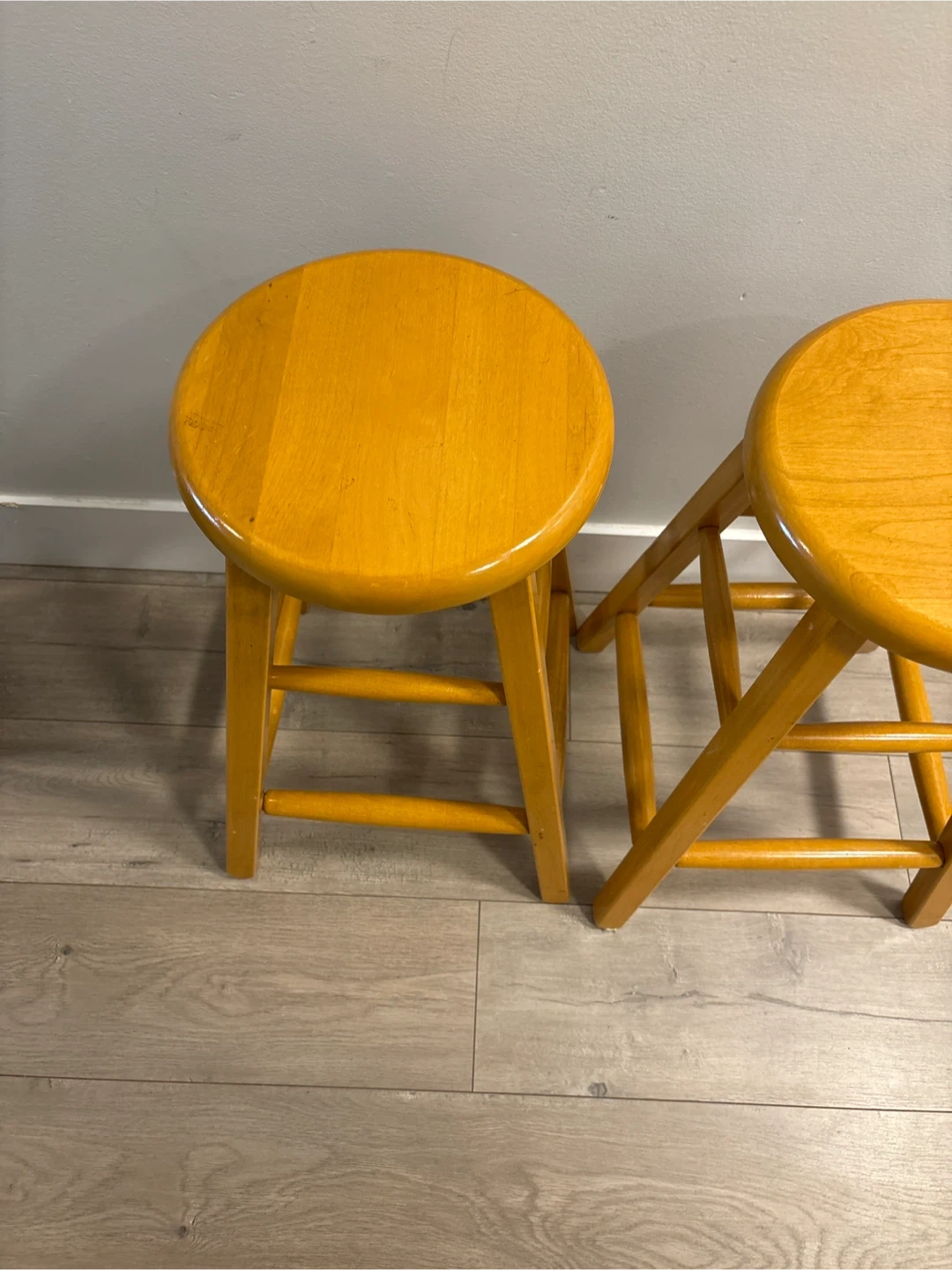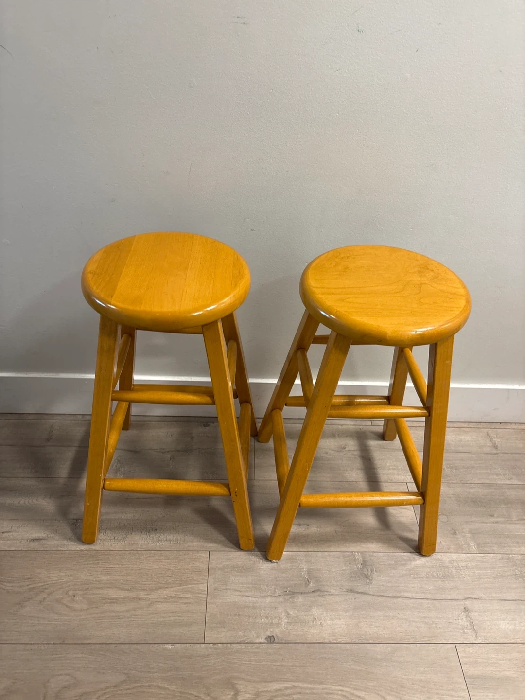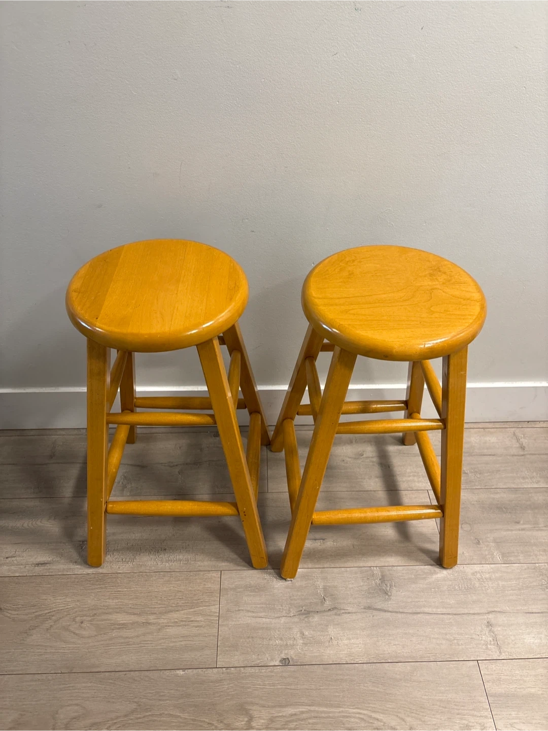 Selling a pair of matching wooden bar stools with a light oak finish. They're sturdy and have a simple, classic design. Each stool has a comfortable round seat and supportive crossbars between the legs. Great for adding extra seating to a kitchen island or home bar!