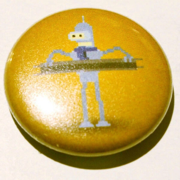 1" circular pin/button featuring Bender from Futurama in a pixel art style. Artwork by www.draculaisstillathreat.com. Pop Culture Collectibles.