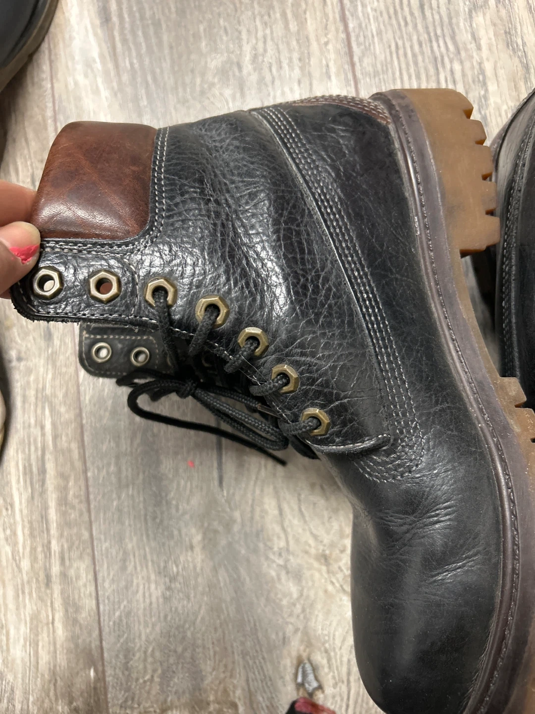 These are black leather work boots. They feature a lace-up closure and a durable sole. The brown collar adds a classic touch to the design. They're suitable for tough jobs.they look unisex