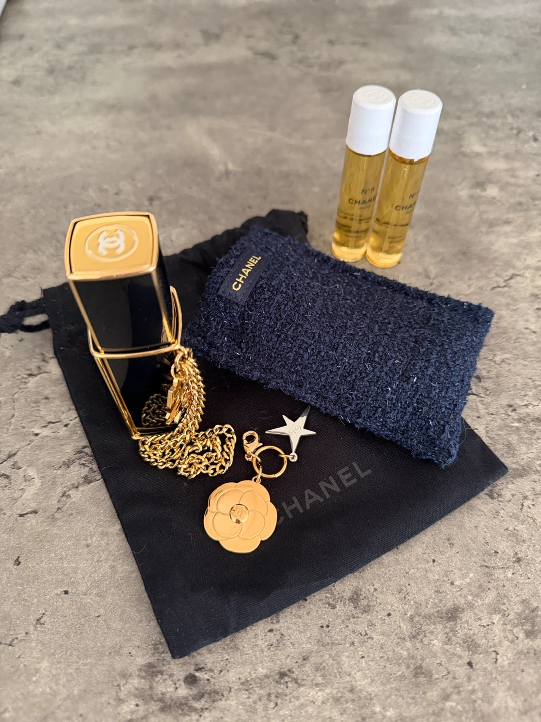 Includes purse spray, two refills, two original CHANEL pouches, and an authentic CHANEL charm received directly from CHANEL.