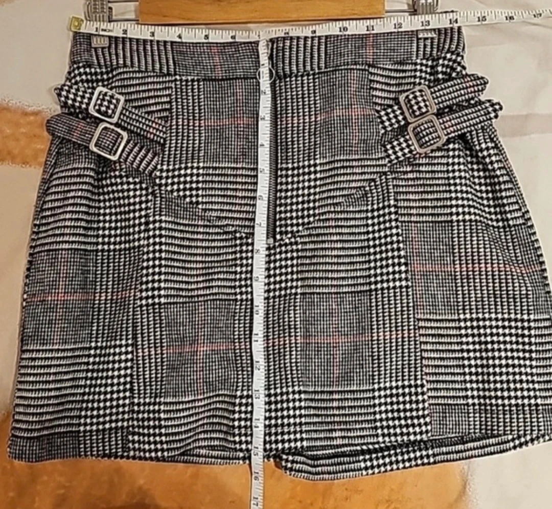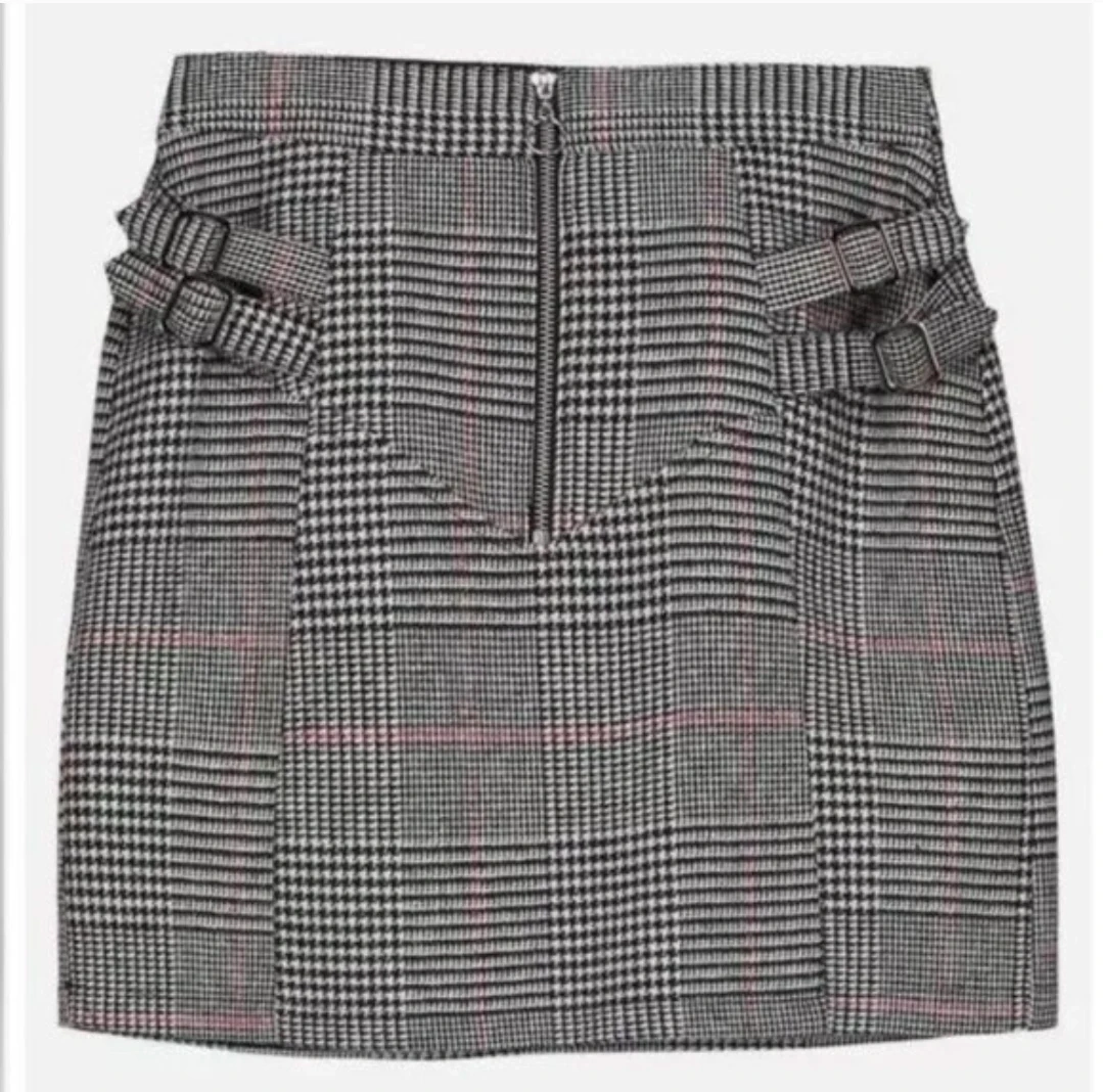 This stylish mini skirt features a classic plaid pattern and decorative buckle details on the sides. It has a front zipper closure for easy wear. It's a great choice for adding a trendy touch to your outfit. Material is a woven blend.