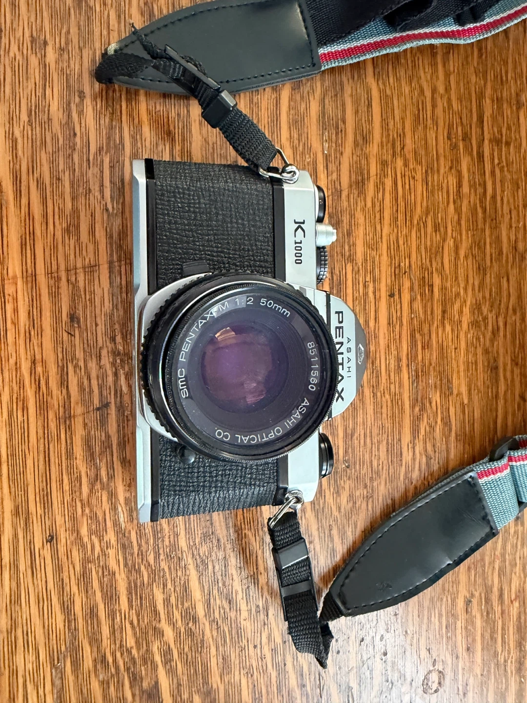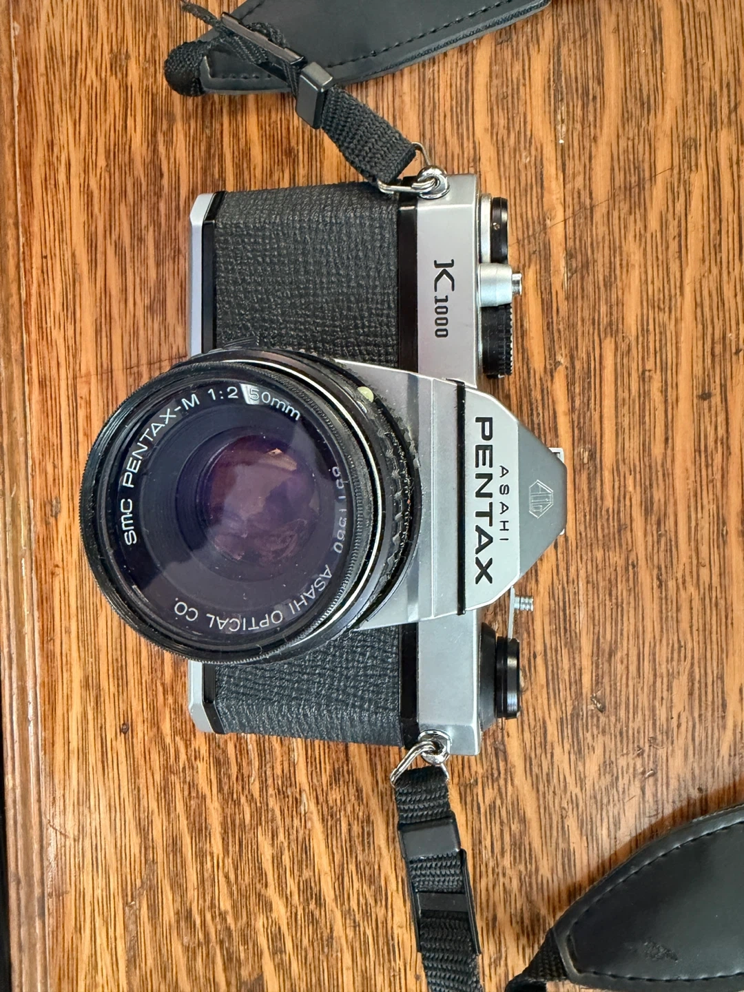 Selling a Pentax K1000 35mm film camera. It's a classic camera that's easy to use and great for beginners. The lens is a SMC Pentax-M 1:2 50mm. Missing lens cap. Light meter needs a new battery.