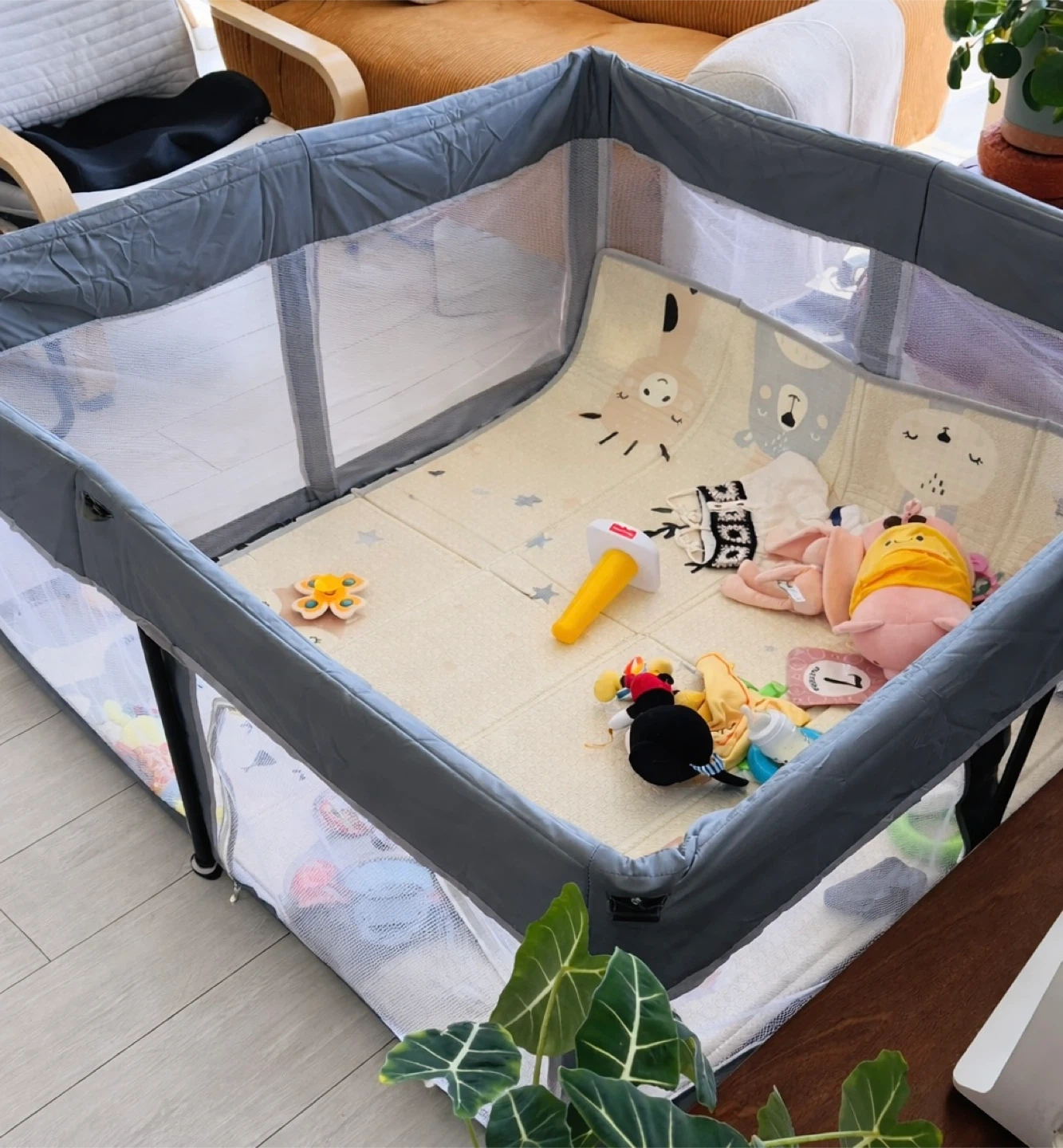 This playpen is 127cm by 127cm and 60cm tall, perfect for little ones to play safely. It features a zipper door for easy access and is made with durable materials. It's spacious enough for toys and a mat. This playpen is great for keeping your child entertained and secure.