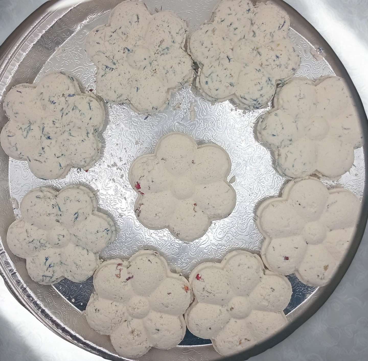 Bath melts shaped like flowers. They're infused with dried flower petals, jojoba oil, and cocoa butter to moisture and hydrates your skin. Great for a relaxing bath!