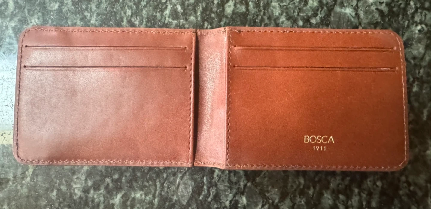 Selling a Bosca leather wallet in new condition. Never used. It's a stylish and functional accessory for everyday use. The wallet features 4 interior card slots and 2 compartments and an additional exterior slot to keep your essentials organized. Exterior clip. The leather has a rich, warm brown color that will develop a beautiful patina over time. Retails for over over $100