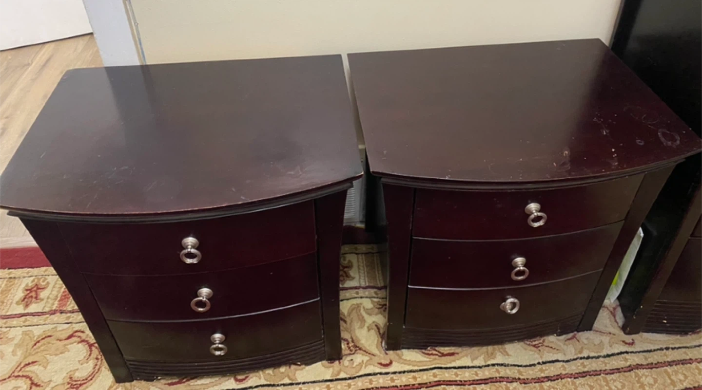 Selling a set of two matching nightstands. They're a dark wood colour and each have two drawers. Width is 25 inches, length is about 19.5 inches and height is 25 inches. There are some signs of wear and tear on the tops, as shown in the photos, but they're still sturdy and functional. One of the draws have stains inside made from craft supplies and makeup.