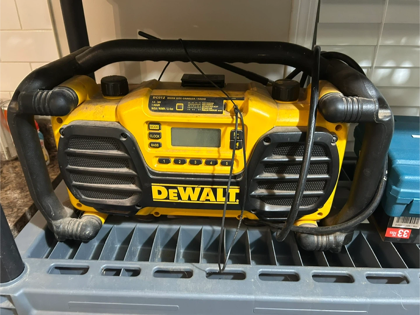 This is a DEWALT DC012 work site charger and radio. It's compatible with NiCd/NiMH/Li-Ion batteries. The unit has controls for mode, clock, and bass.