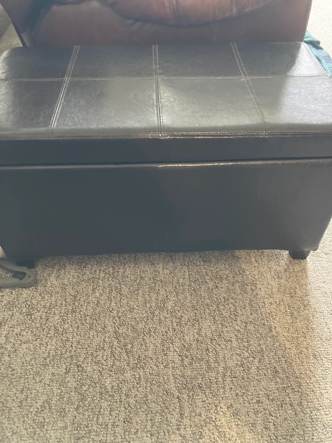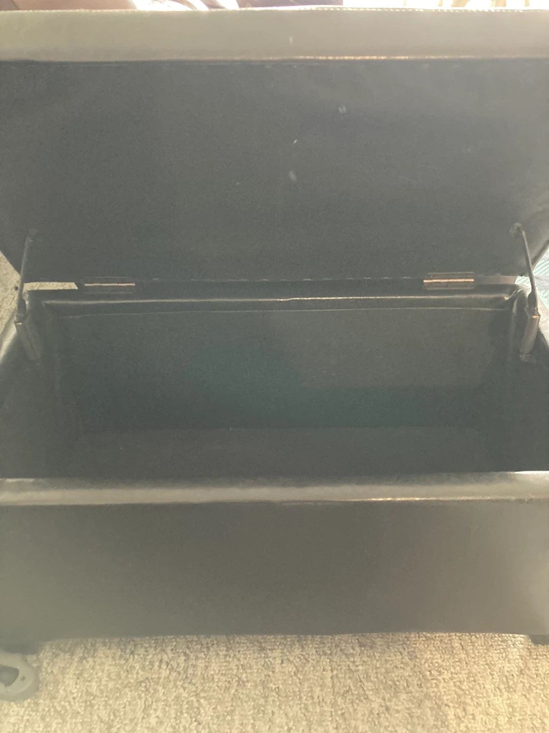 Black faux leather storage ottoman. It's hinged to lift open for extra storage space. Dimensions appear to be approximately 40" long, 18" wide, and 18" high. This ottoman would be useful for storing blankets, pillows, or toys.