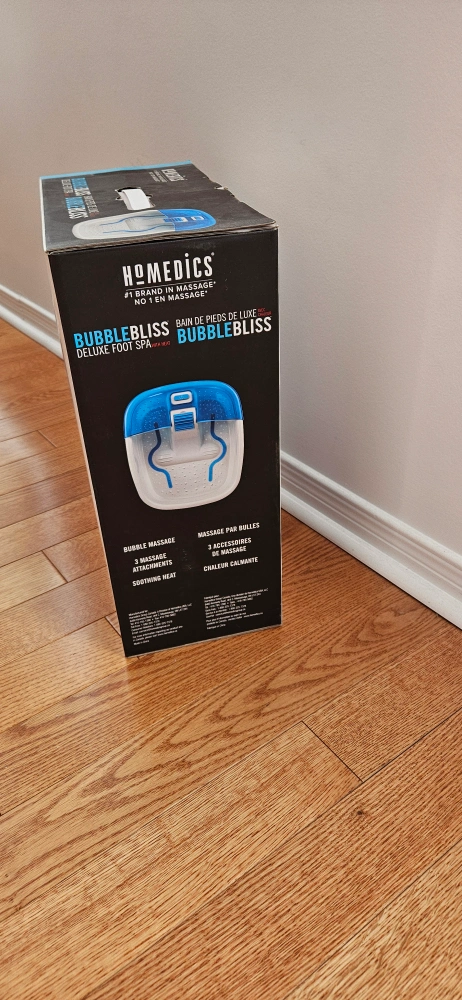 Selling a brand new Homedics Bubble Bliss Deluxe Foot Spa, still in its original box! This foot spa features massaging bubbles and soothing heat to rejuvenate your feet. Comes with 3 accessories for a customized massage experience. Perfect for relaxing after a long day!