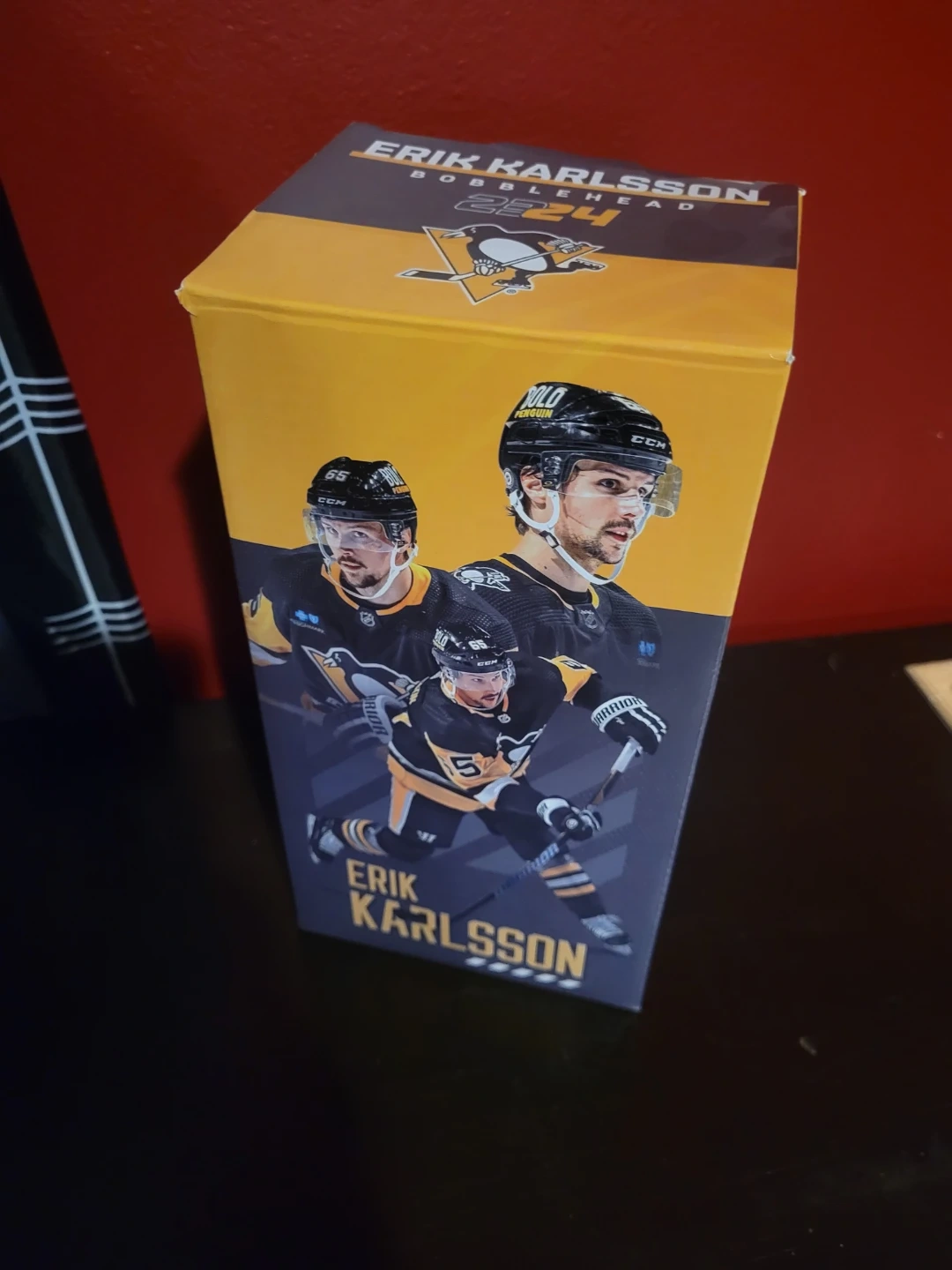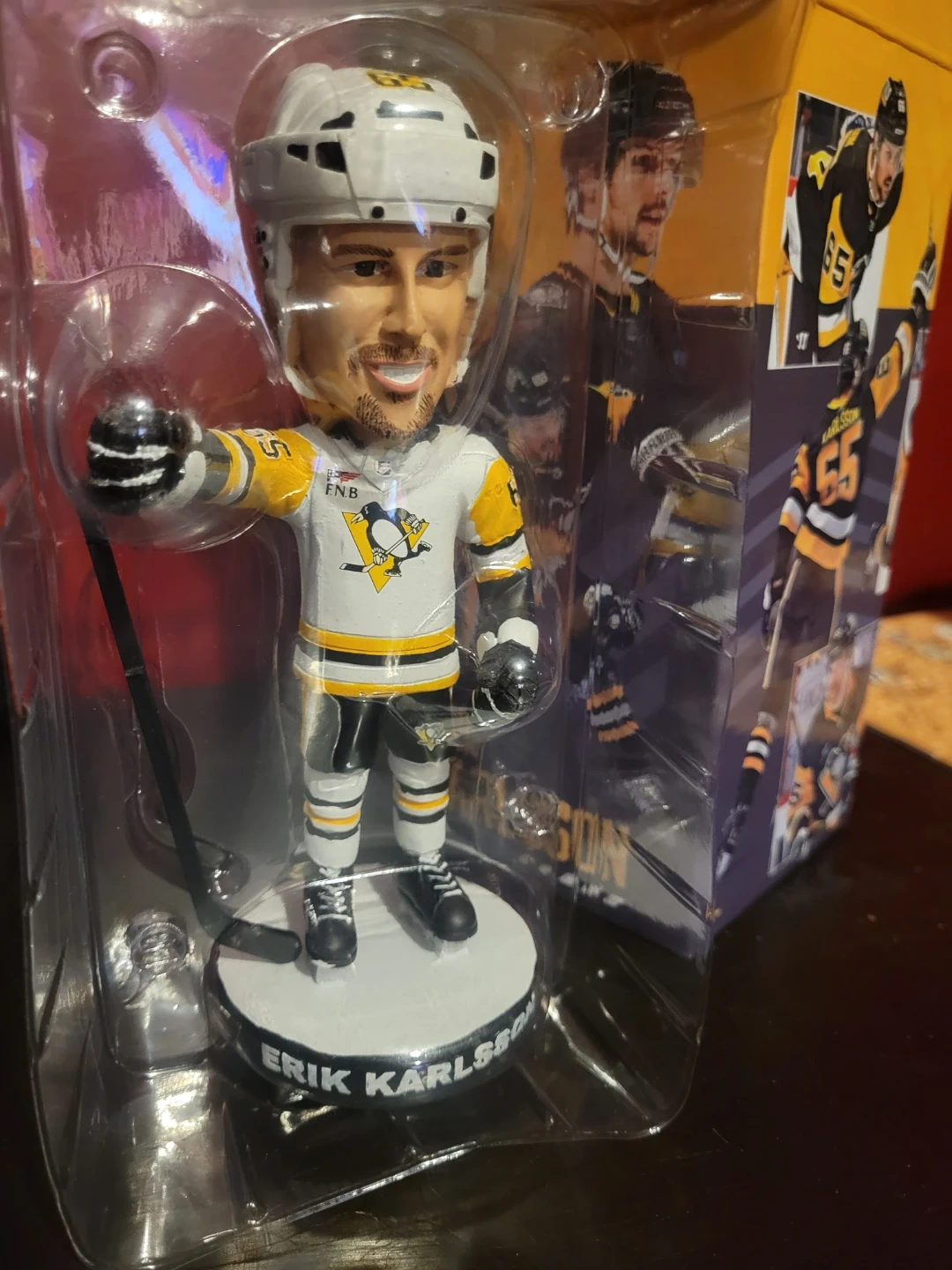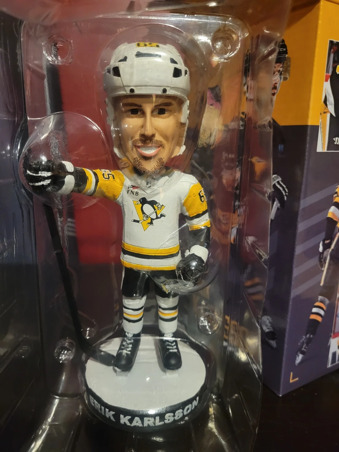 This is an Erik Karlsson bobblehead in Pittsburgh Penguins gear. It's in its original packaging and comes with a display base. A great item for any hockey fan!