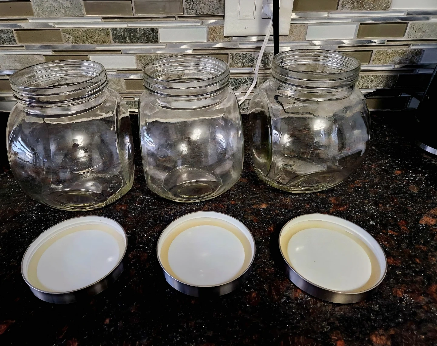 This is a set of three clear glass storage jars. They come with silver lids that have a white sealing insert. Perfect for storing dry goods or decorative items!