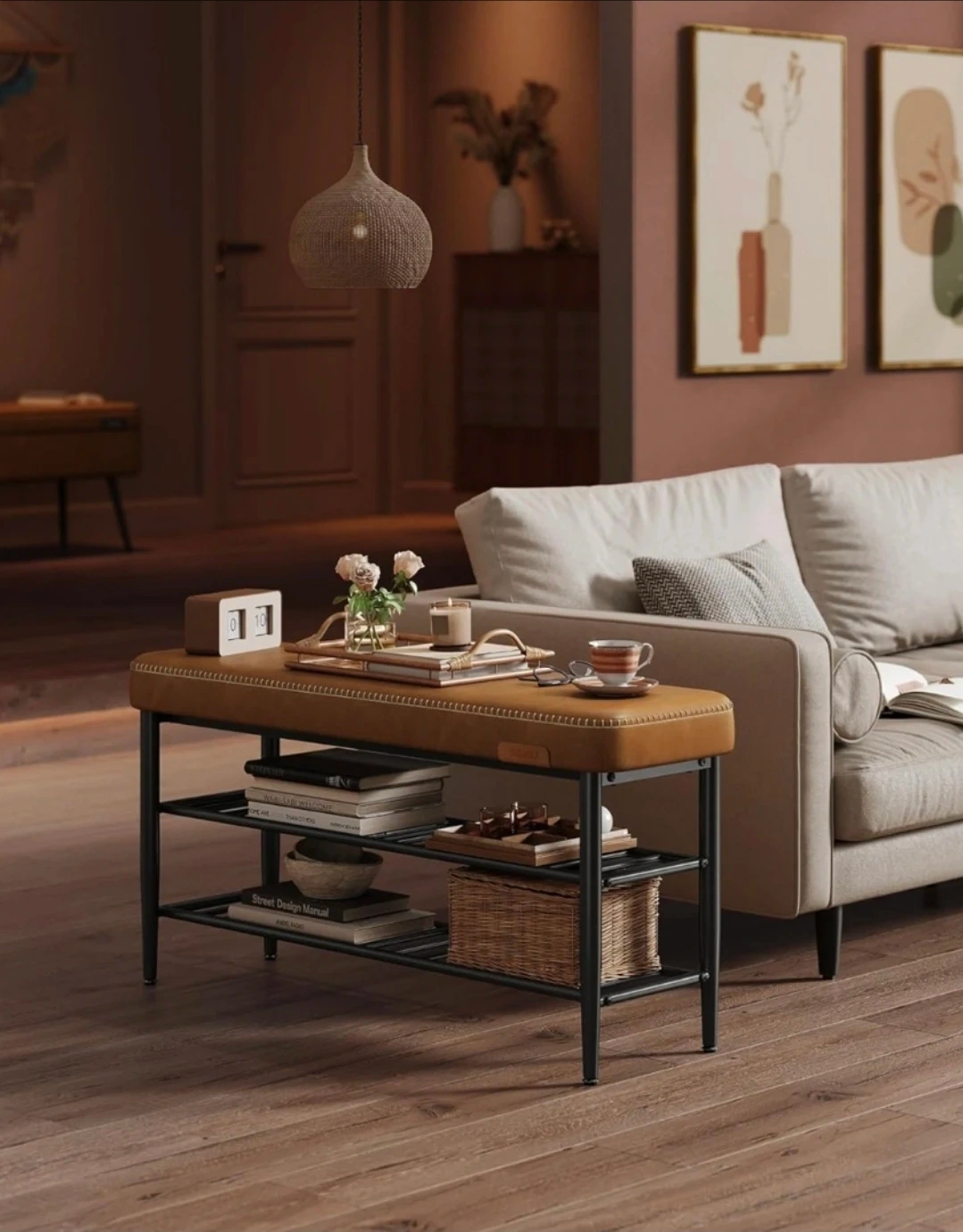 This padded brown bench is brand new, elegant, high quality, and comfortable - has a padded leather seat and 2 shelves for storage. It's useful to put in the entryway, living room, or bedroom. It's brand new and still in box. I can assemble for extra $5 deposited in advance. The original price was $373+ with tax without assembly fee yet (save $$ and time), so price is not negotiable. See dimensions and other features in the pictures.