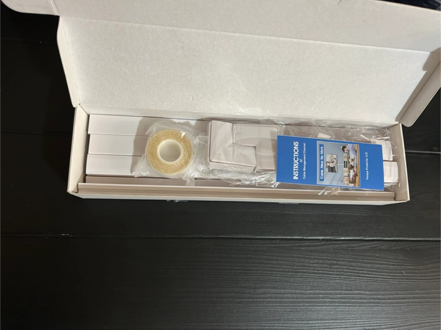 This is a YECAYE 125in cable concealer kit. It includes 13.7 inch channels, 7 couplings, 1 T-fitting, 4 flat elbows, 1 outside elbow, 1 inside elbow, adhesive tape, and 16 mounting screws. It's designed for tidying and organizing cables, making it ideal for home entertainment systems. White colour.