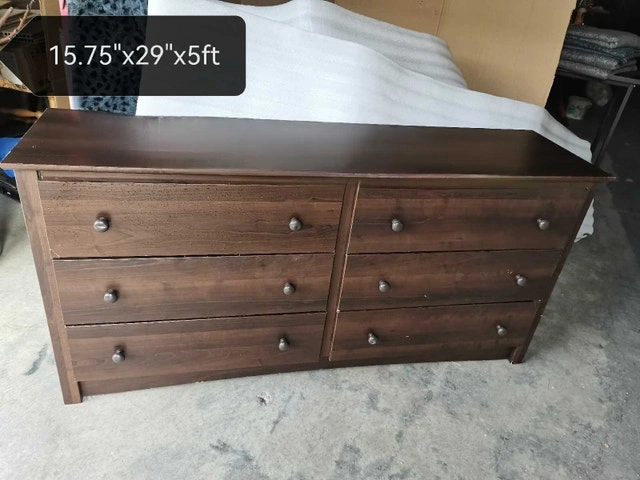 This used 6-drawer dresser offers ample storage with dimensions of 15.75" x 29" x 5ft, perfect for organizing your wardrobe. It has a warm, wood-like finish that complements any bedroom decor. Specifications:
