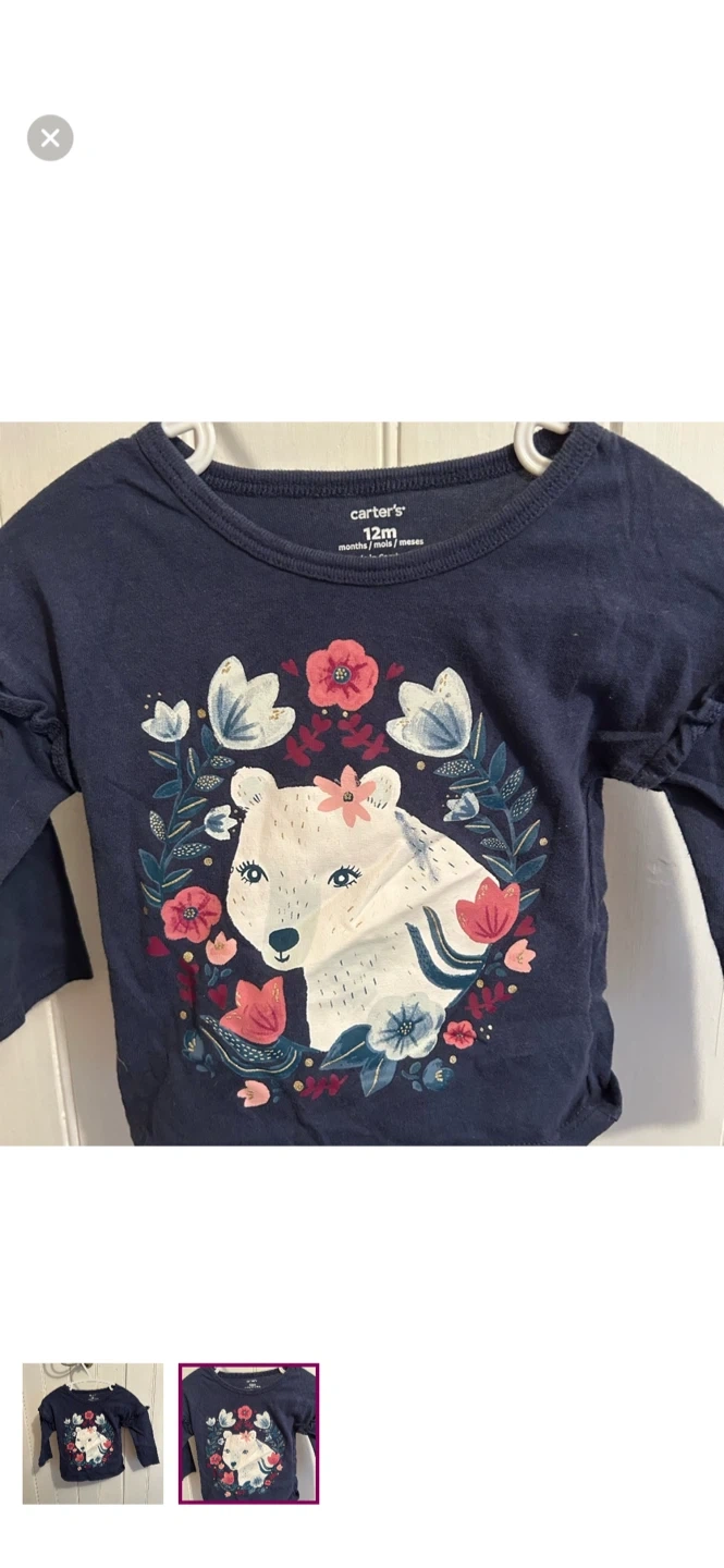 Carters brand. Long sleeve top. Navy with white bear and pink & blue floral graphic. Size 12m. Brand new condition
