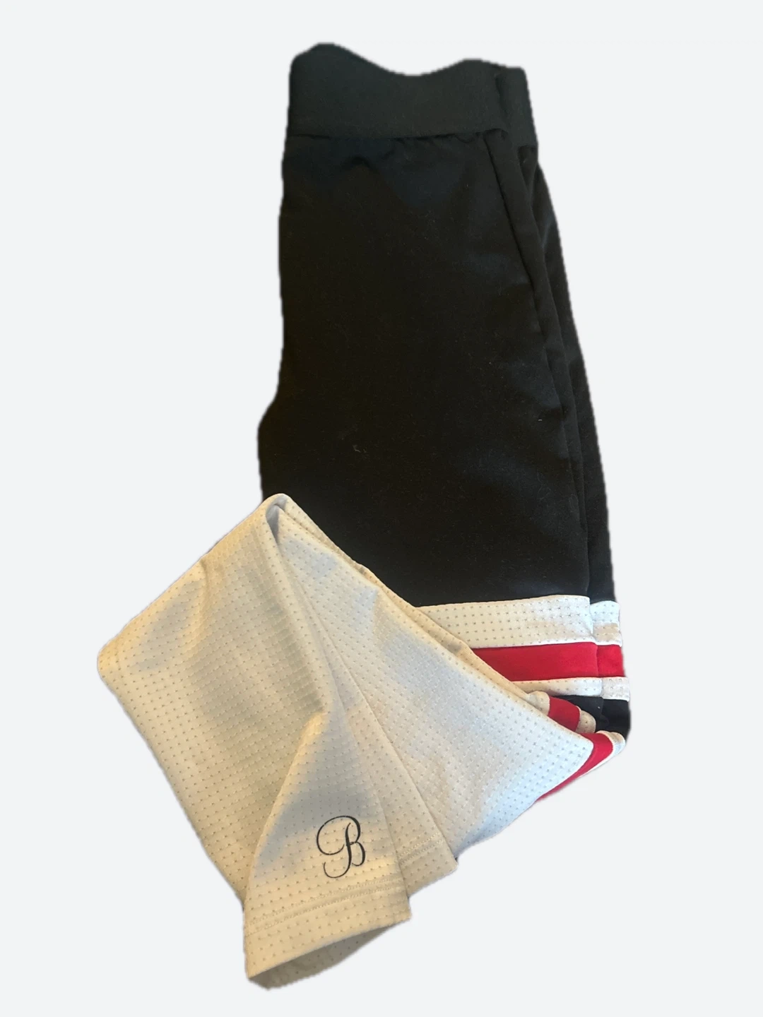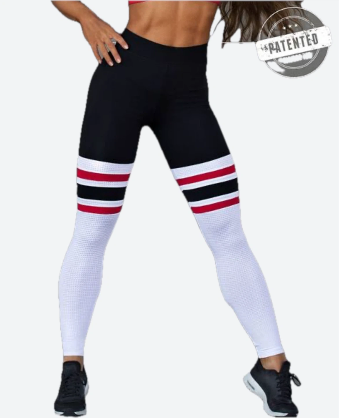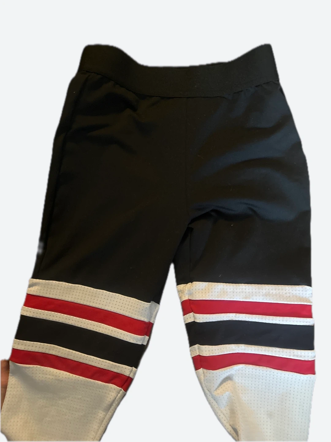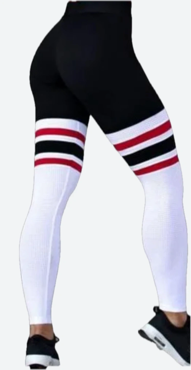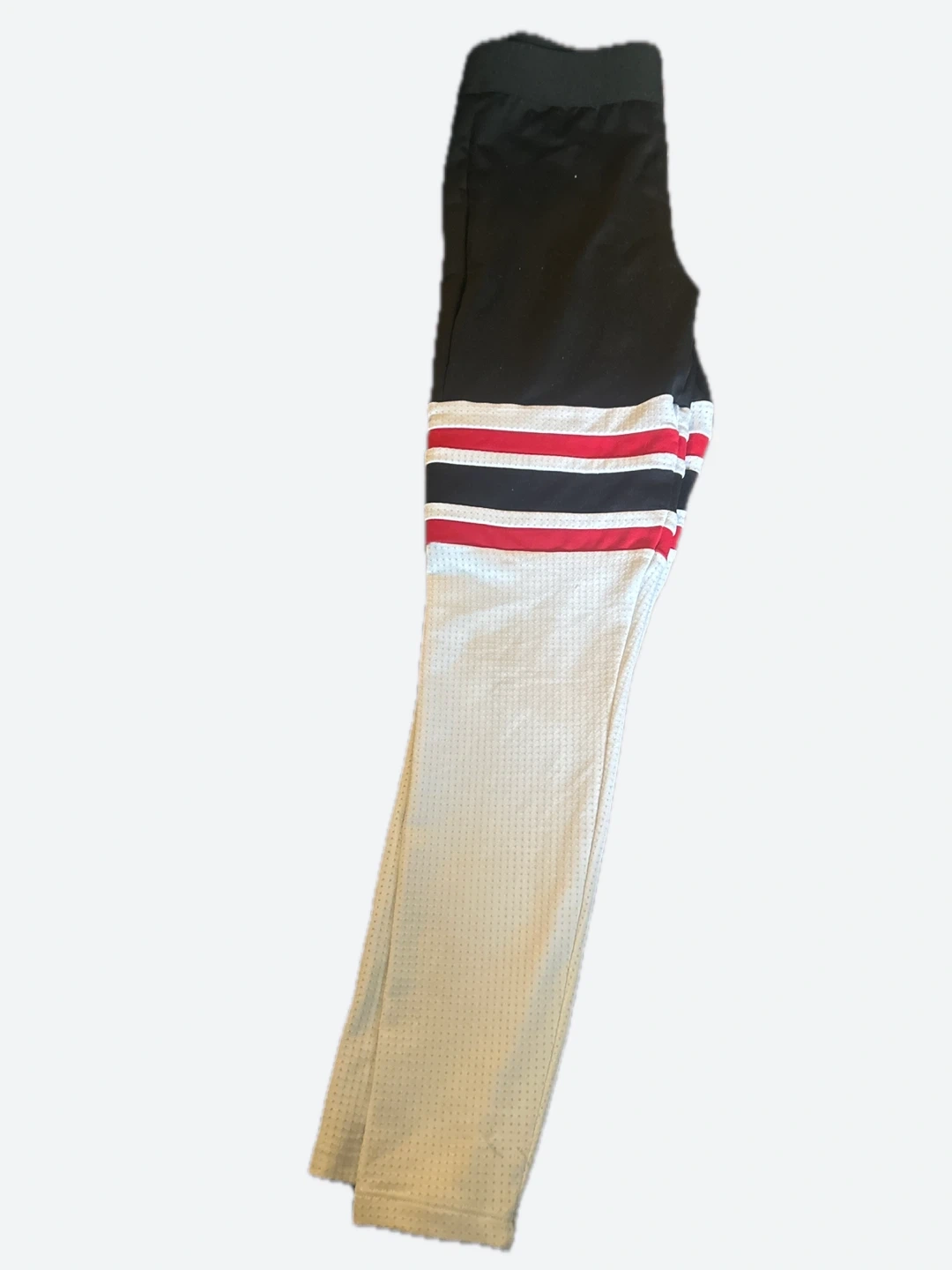 These are THE Thigh High leggings from Bombshell Sportswear which feature white perforated (mesh) lower legs with red and black stripes. They're a size small. Lay flat to air dry, do not iron or bleach.