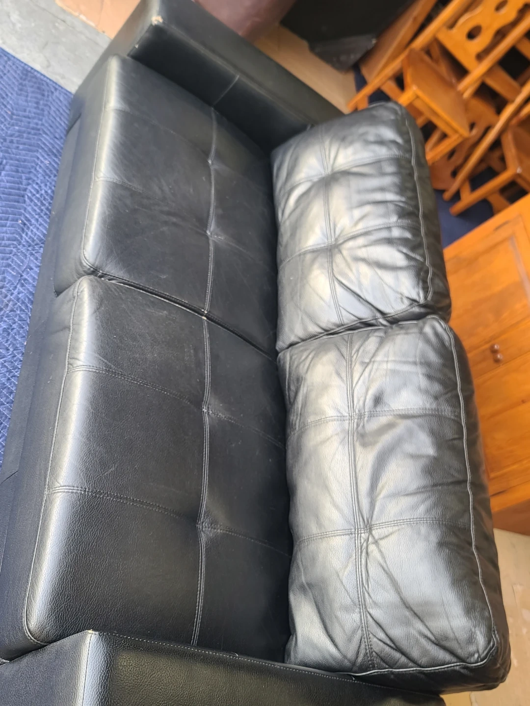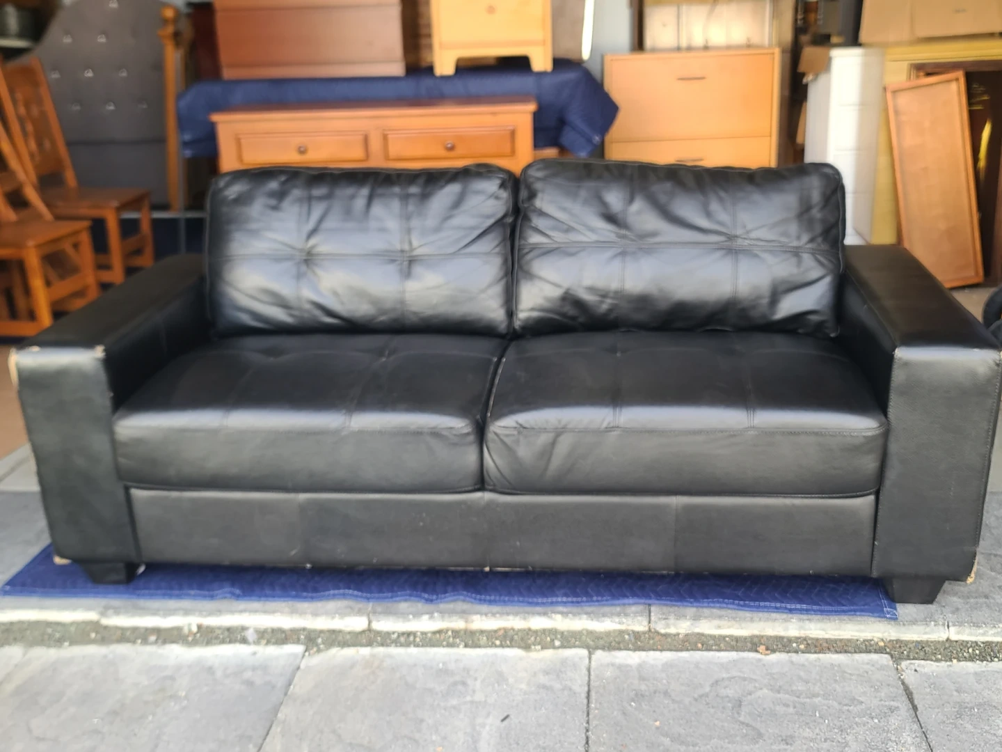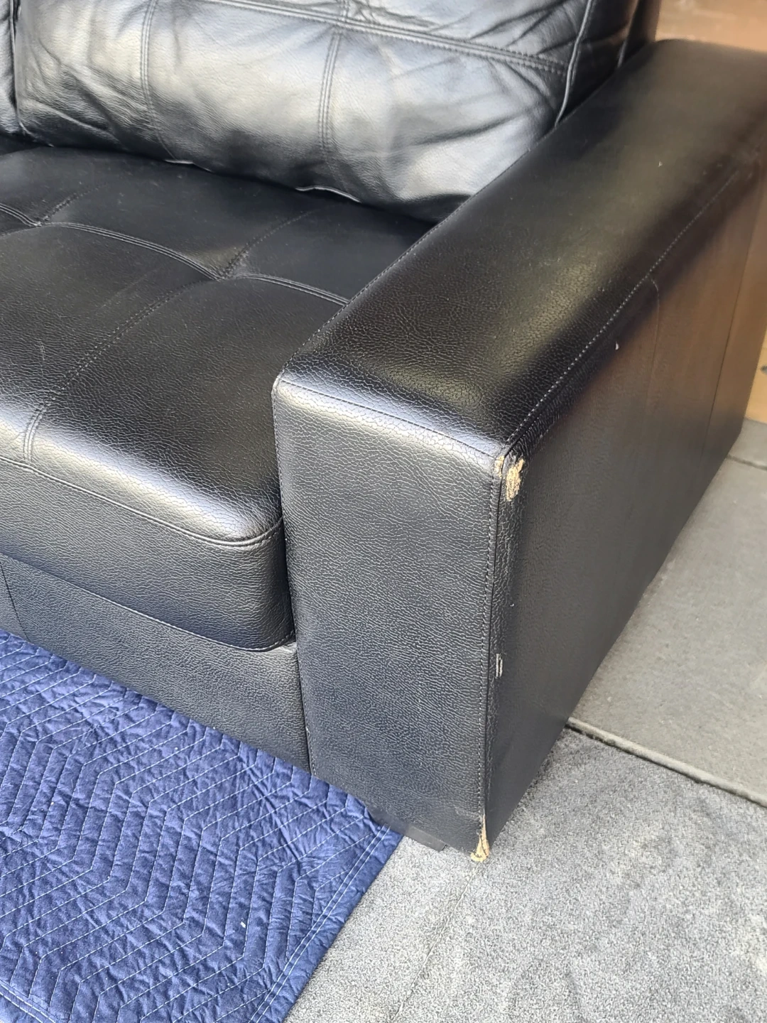 Black faux leather loveseat with button-tufted back cushions. Some wear visible on the armrests, as shown. Includes a matching ottoman. Measurements to follow. Delivery can be arranged. Viewing and pickup by appointment.