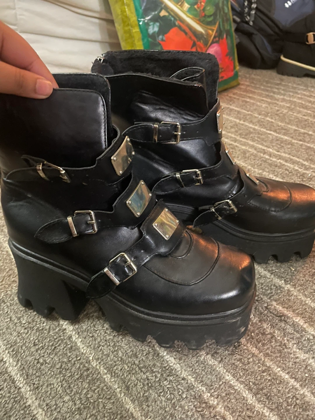 These are a pair of black platform ankle boots featuring multiple buckle straps and a chunky heel. They have a unique and stylish design, perfect for adding an edgy touch to any outfit. The boots are in great condition and ready for a new home!
