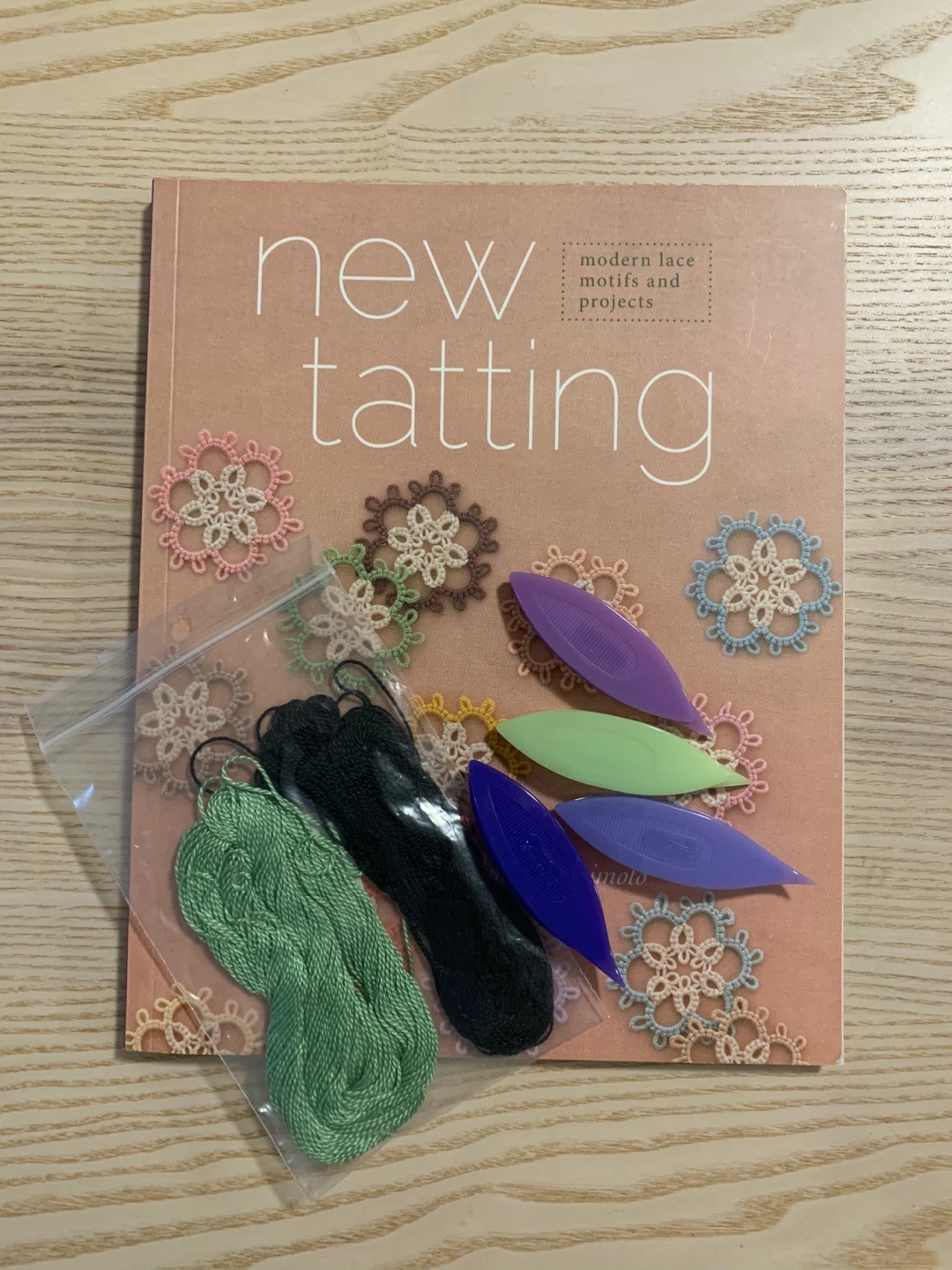 This book is titled 'New Tatting' and includes modern lace motifs and projects. It comes with several tatting shuttles in assorted colours and some embroidery thread. Great for anyone interested in learning or practising tatting!