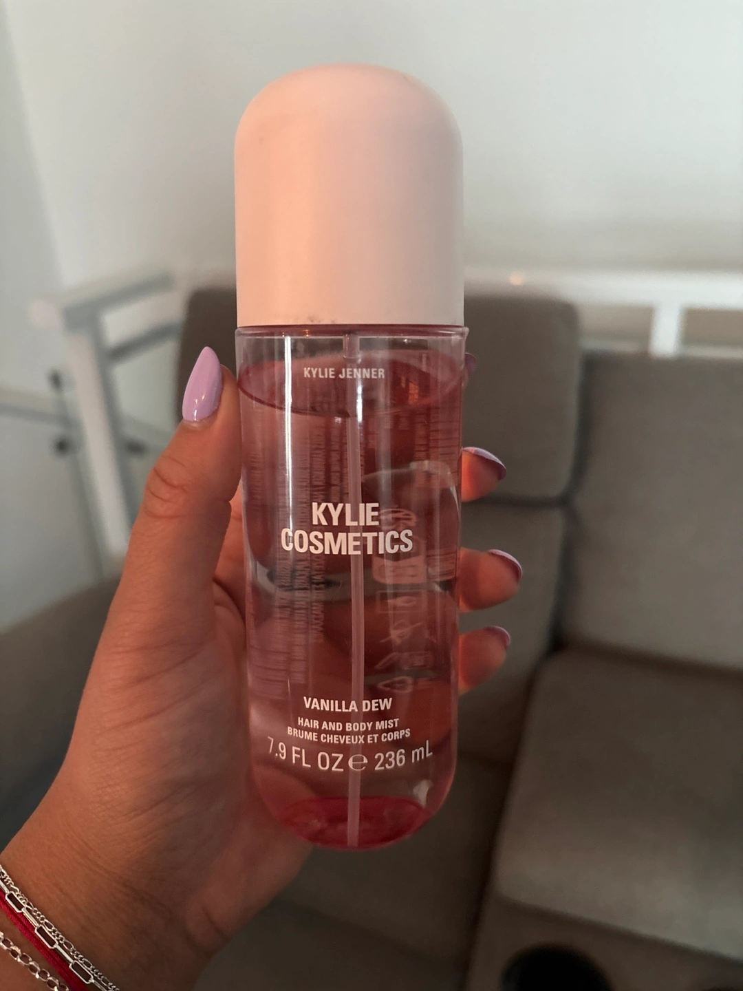 Kylie Cosmetics Vanilla Dew Hair and Body Mist. Comes in a 236ml bottle. Great for a refreshing scent on hair and body!