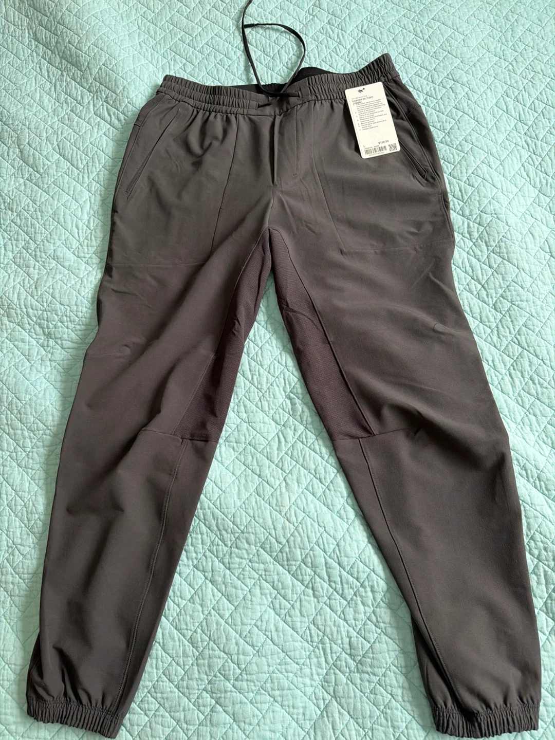These lulelemon are in a charcoal grey colour. They're made with comfortable, stretchy fabric and feature an elastic waistband with a drawstring. Mesh paneling is present on the sides of the legs for breathability. Brand new