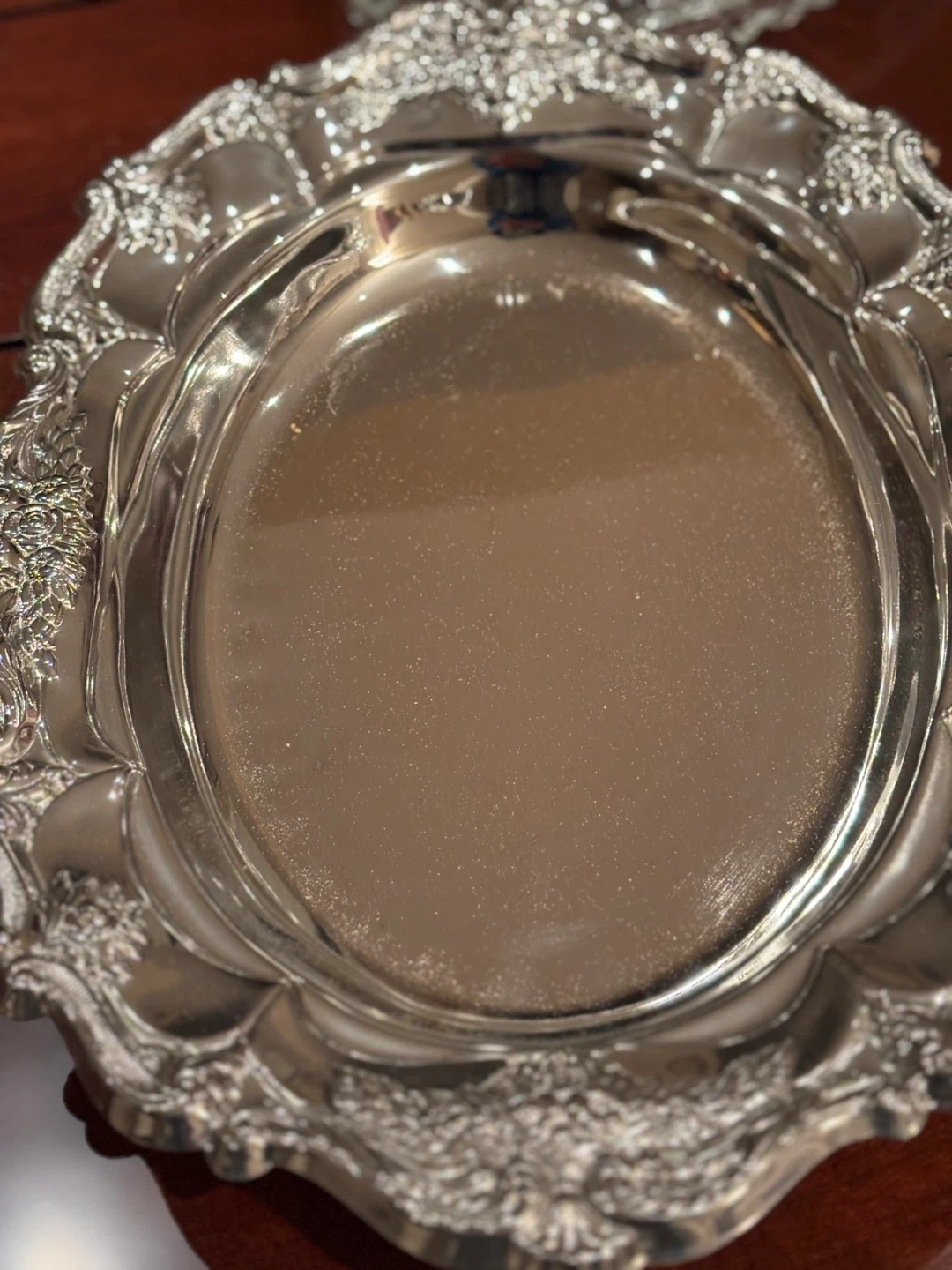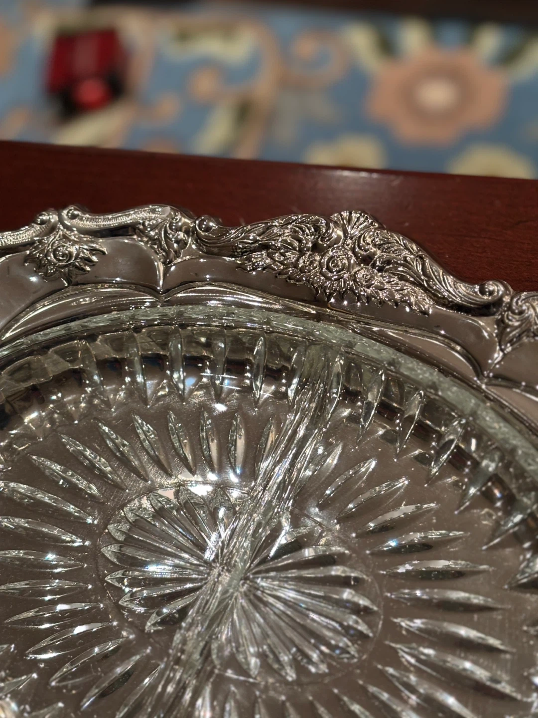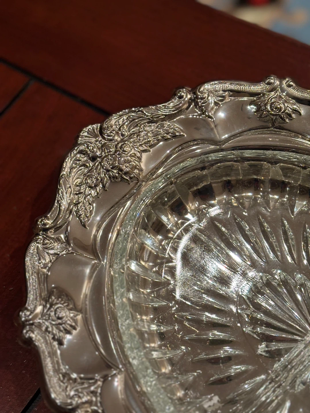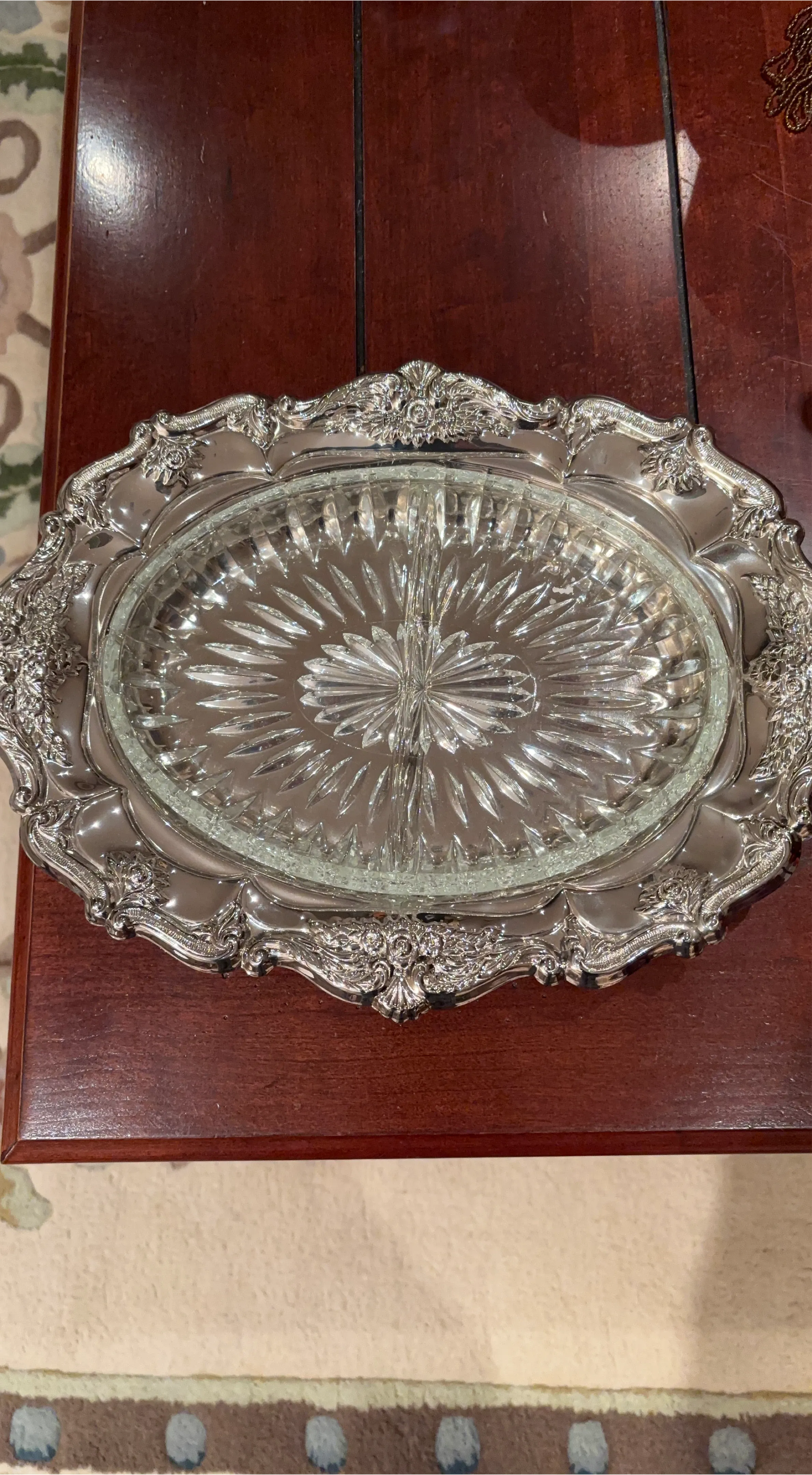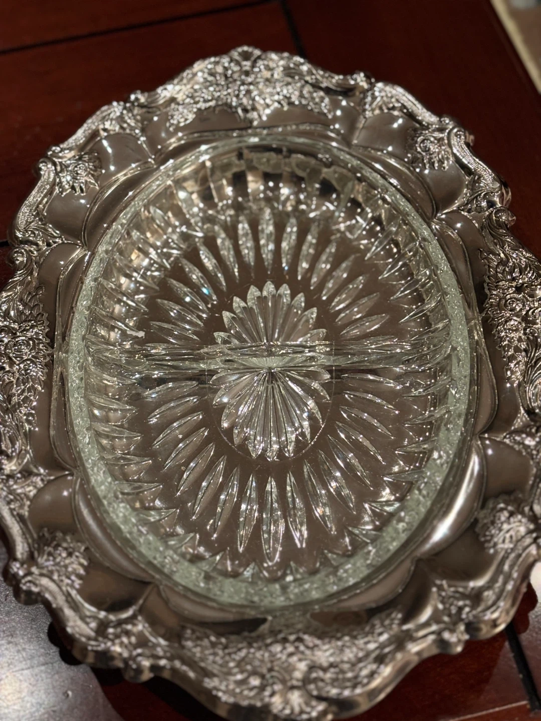 Beautiful divided serving tray featuring a clear, cut glass insert. It's surrounded by an intricately detailed silver-plated ornate frame. This piece is great for serving appetizers or candies!