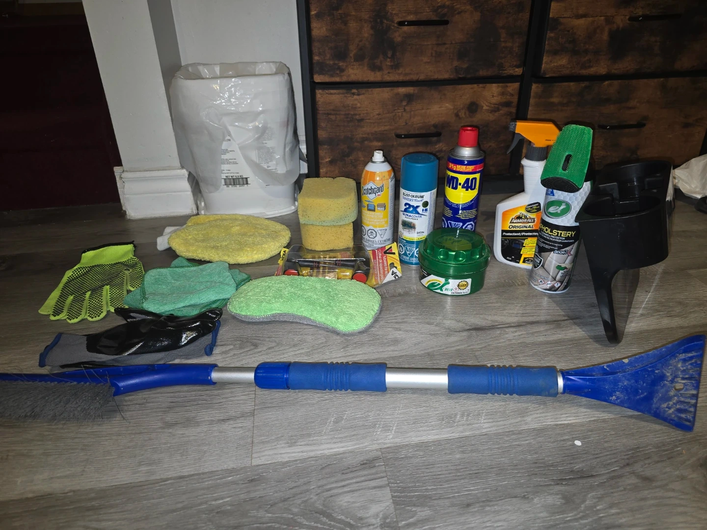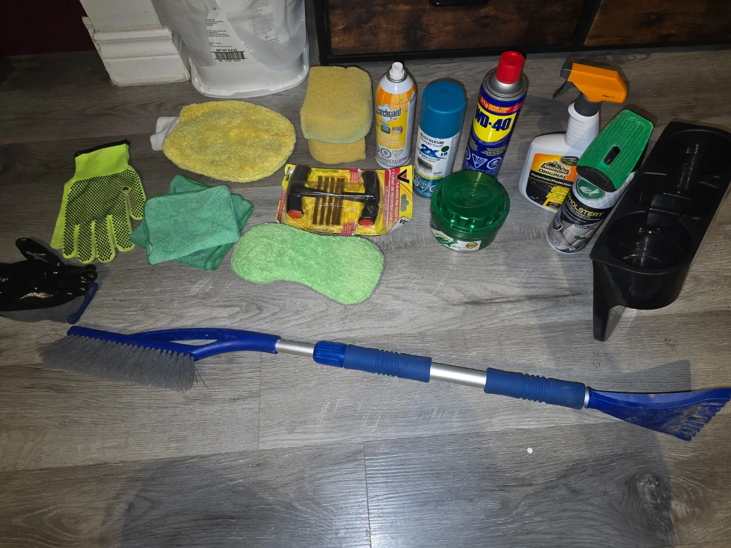 This bundle includes various car cleaning and detailing items like a snow brush, sponges, microfiber cloths, and cleaning sprays. Also included are WD-40, Gumout, and Turtle Wax products. It's a great collection for maintaining your vehicle's cleanliness and winter readiness.