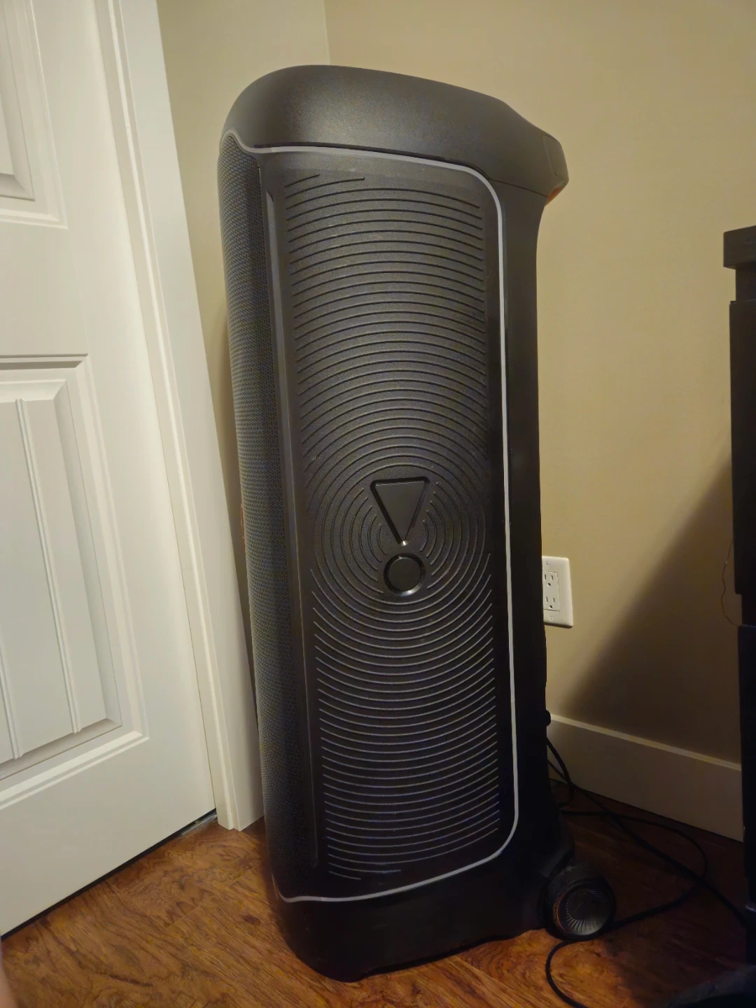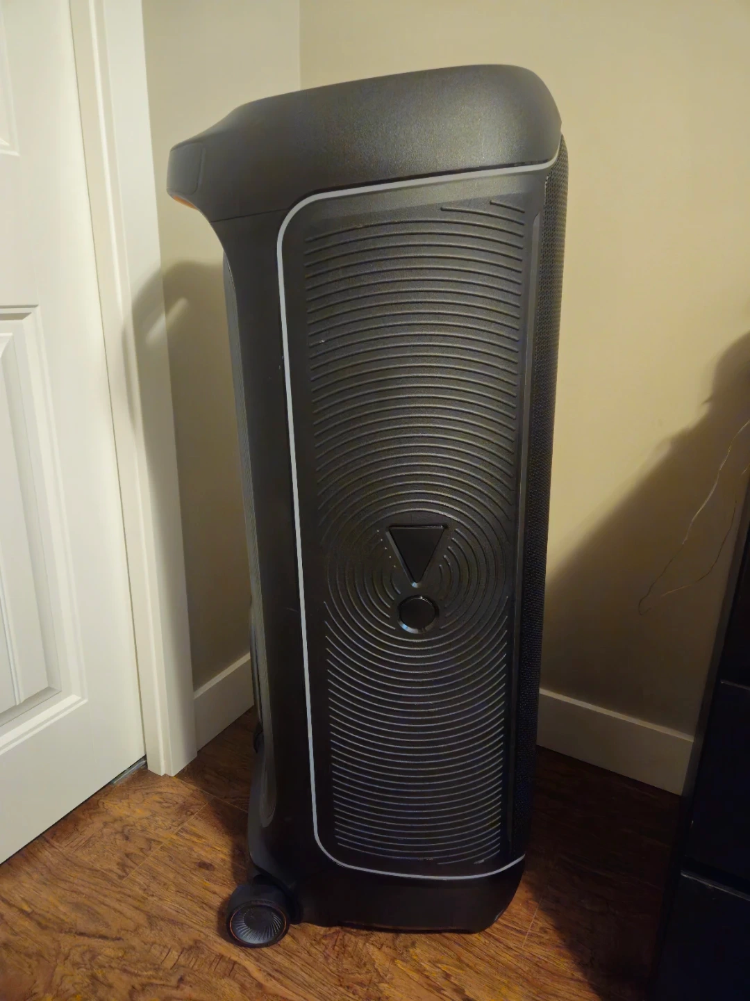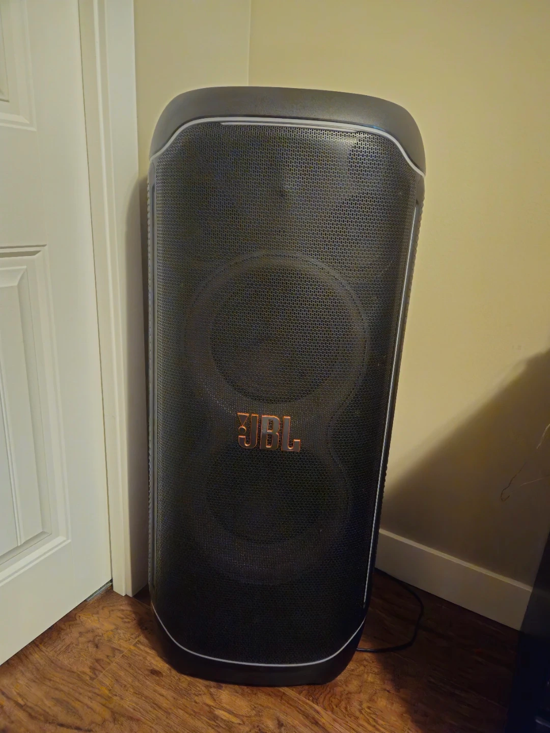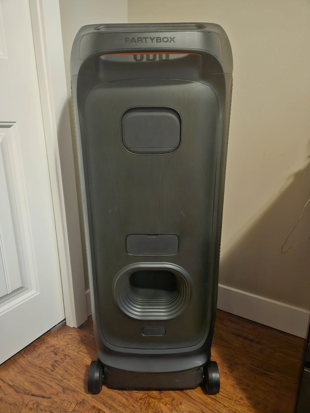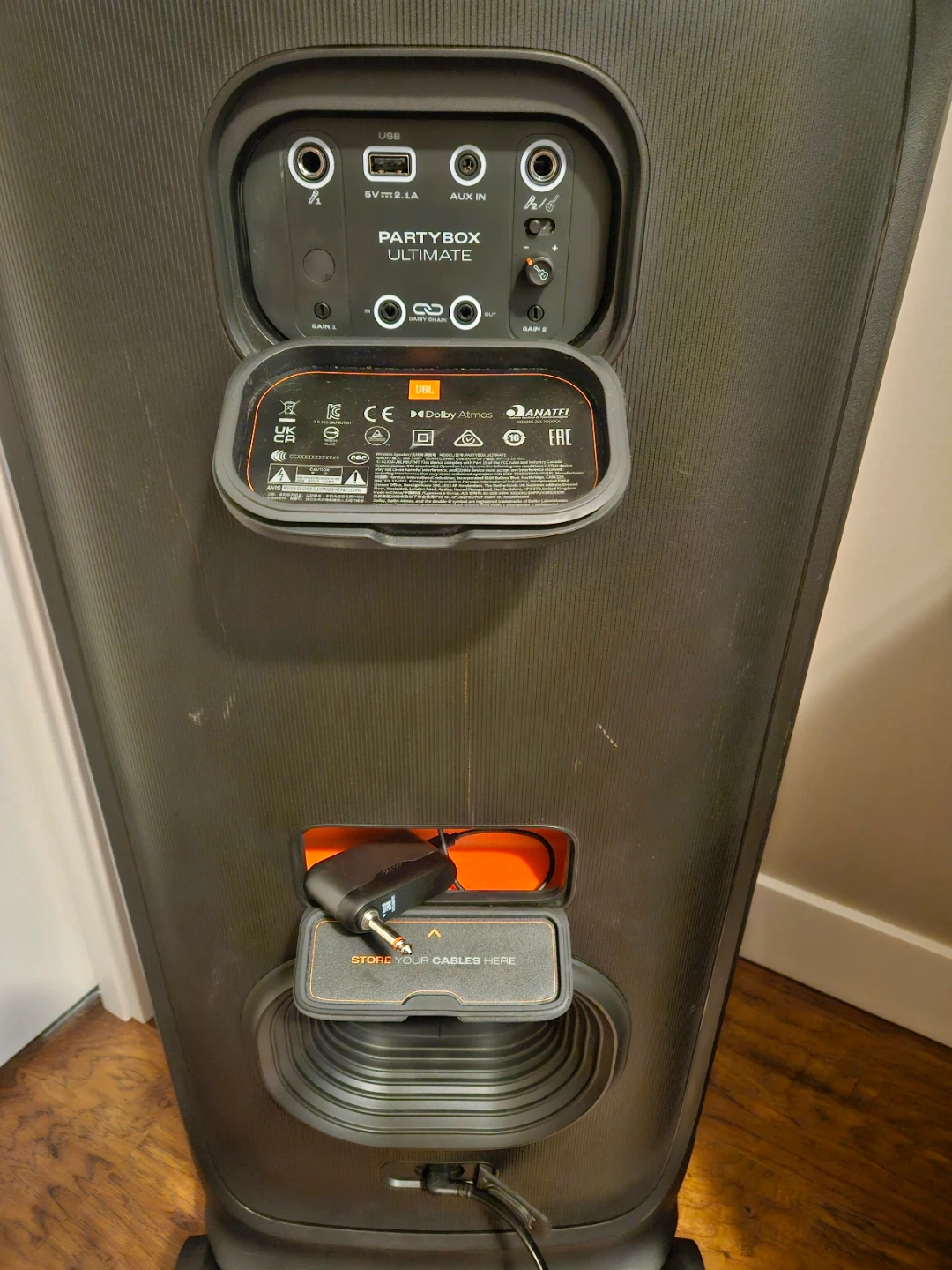 This is a JBL PartyBox Ultimate portable speaker with 2 mics. It's great for parties and events! The speaker has wheels for easy transport and comes with a charging cable. It supports USB and Aux inputs, and Dolby Atmos.
