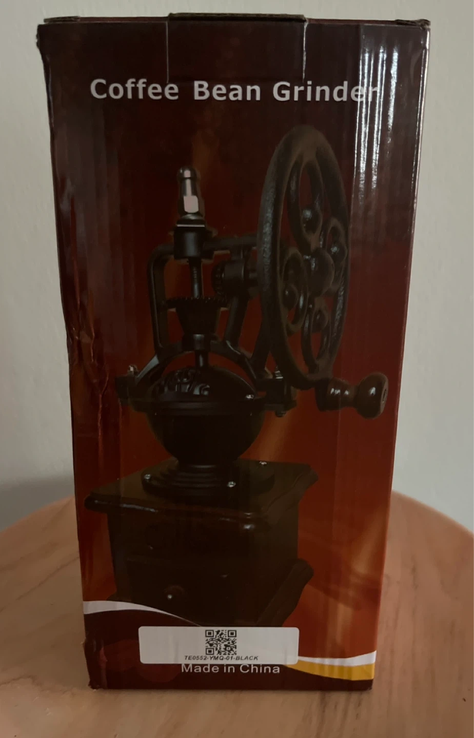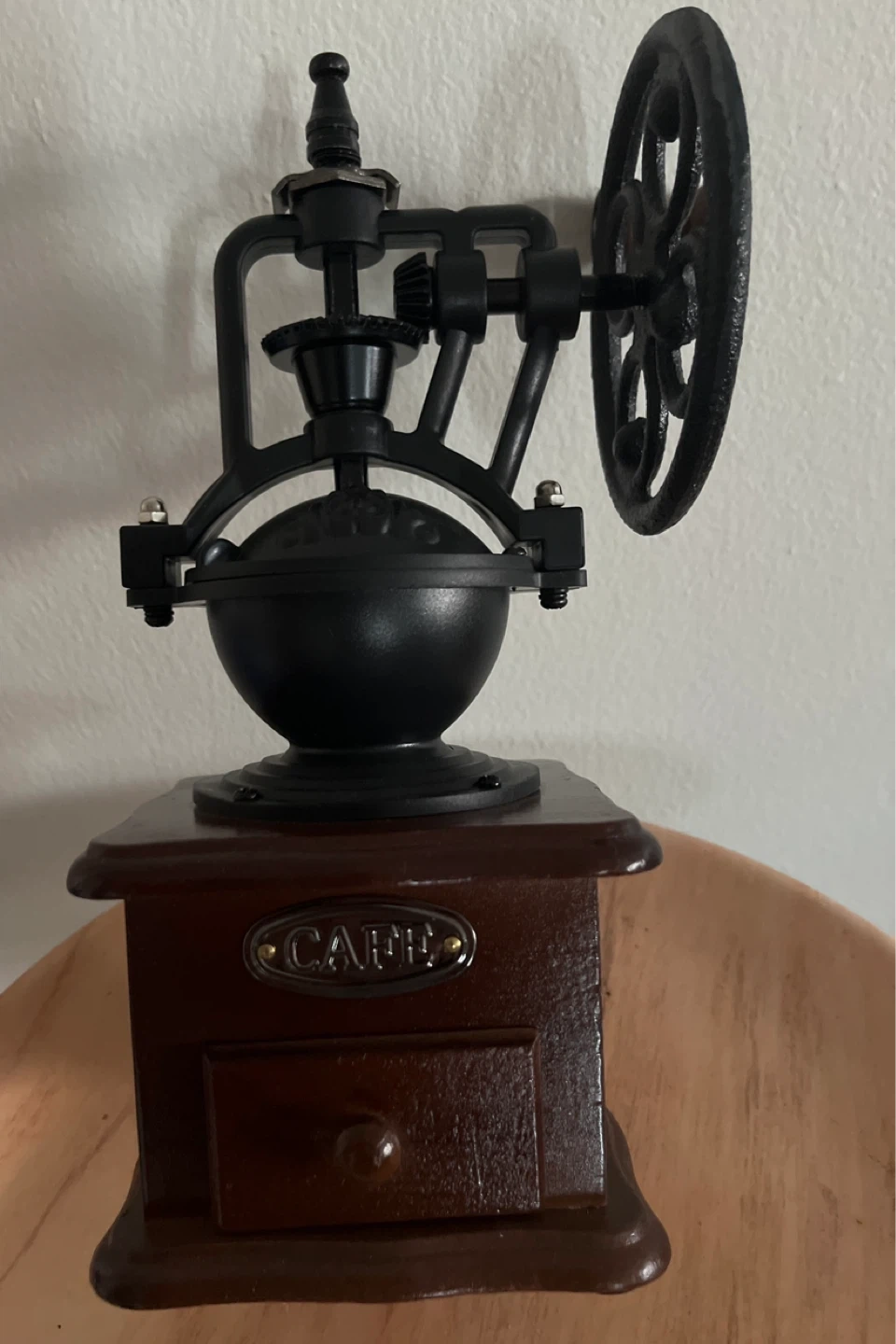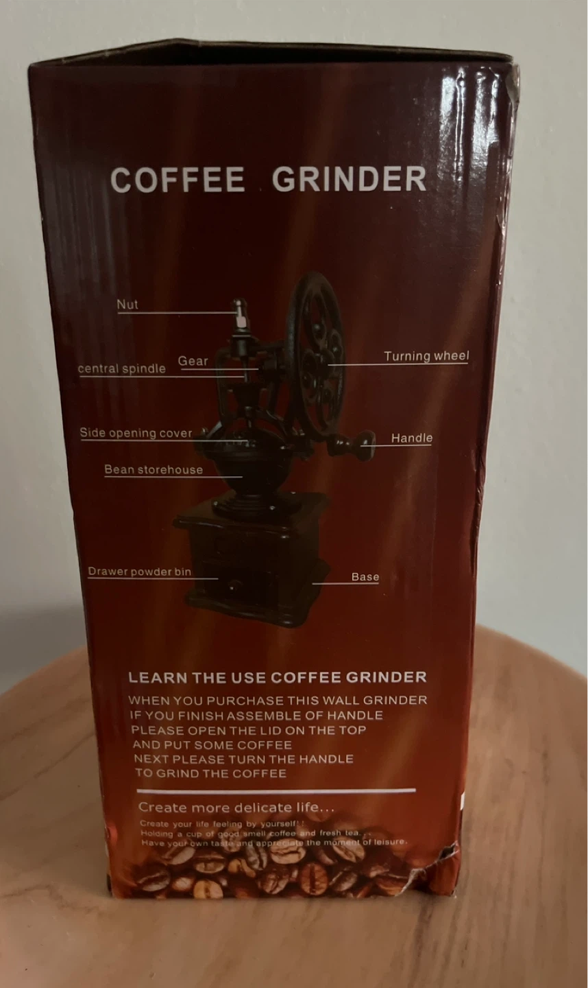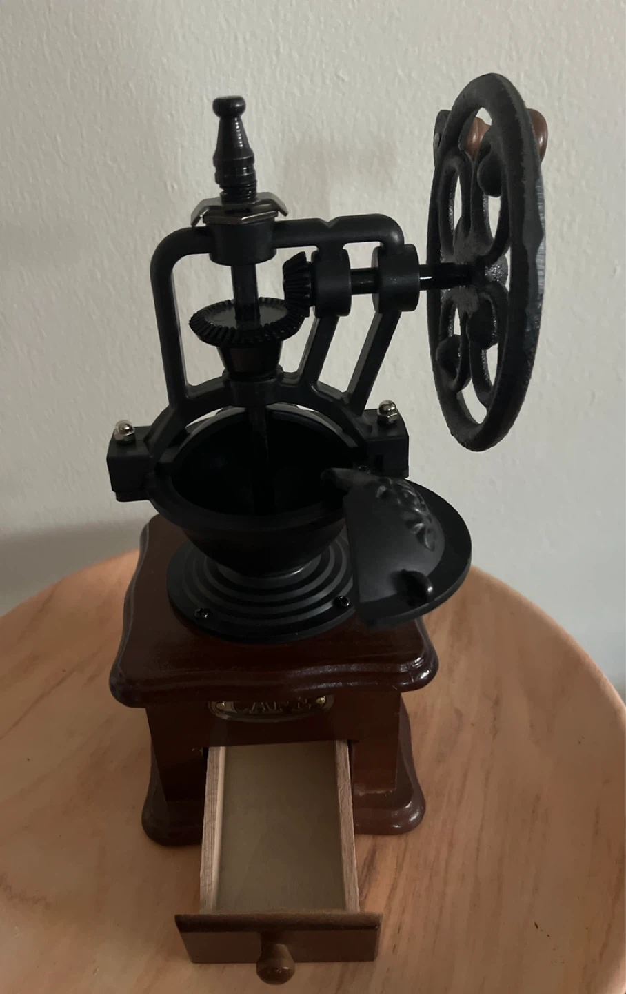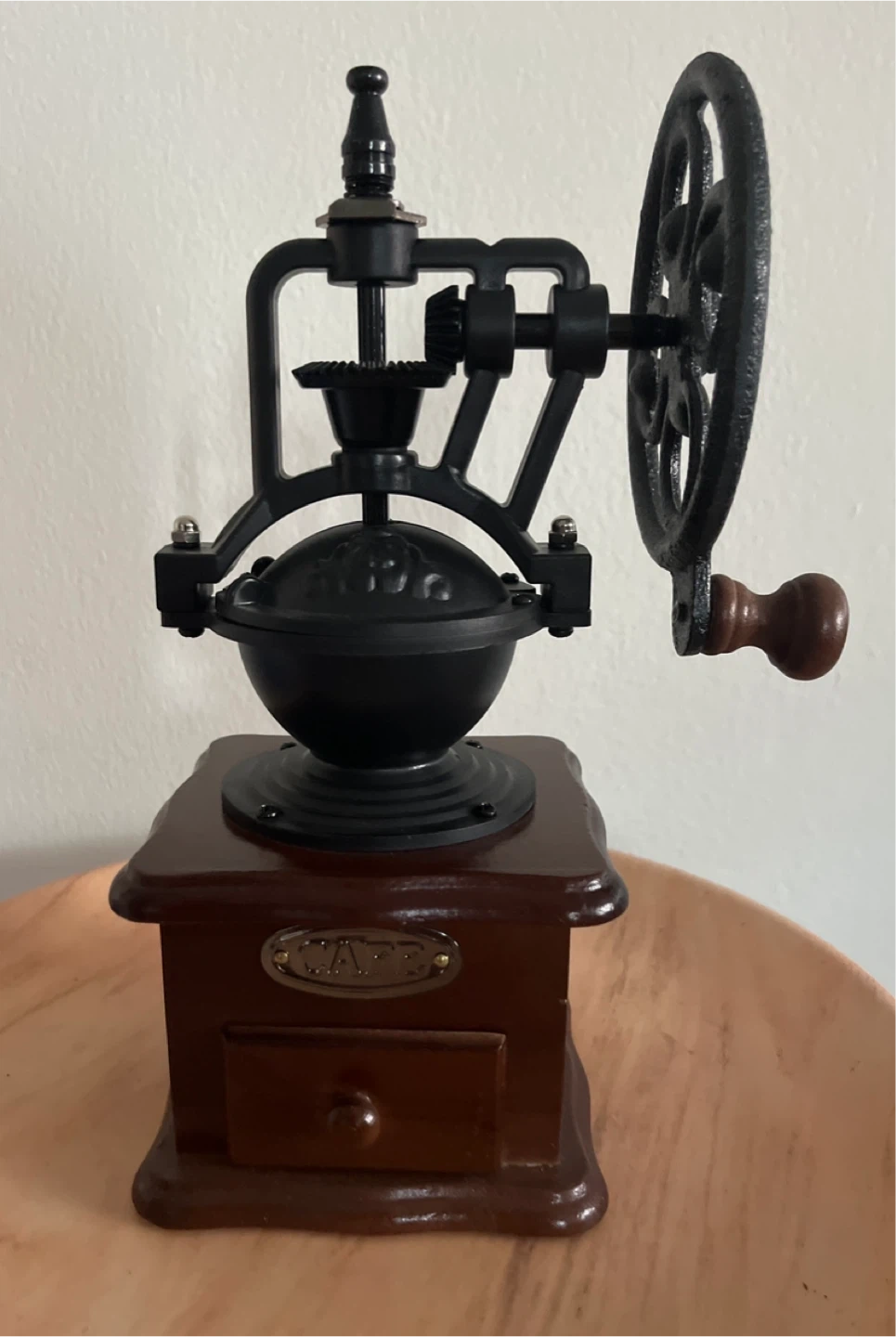 This manual coffee grinder features a vintage design with a wooden base and a cast iron mechanism. It includes a crank for grinding beans and a small drawer to collect the grounds. It's a great piece for a coffee lover's kitchen!