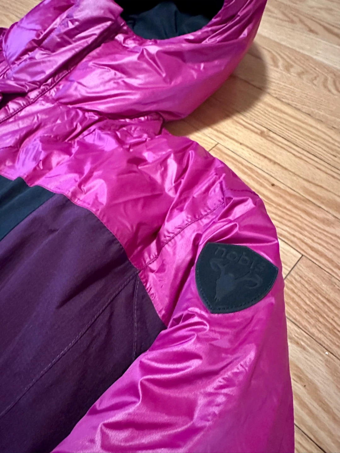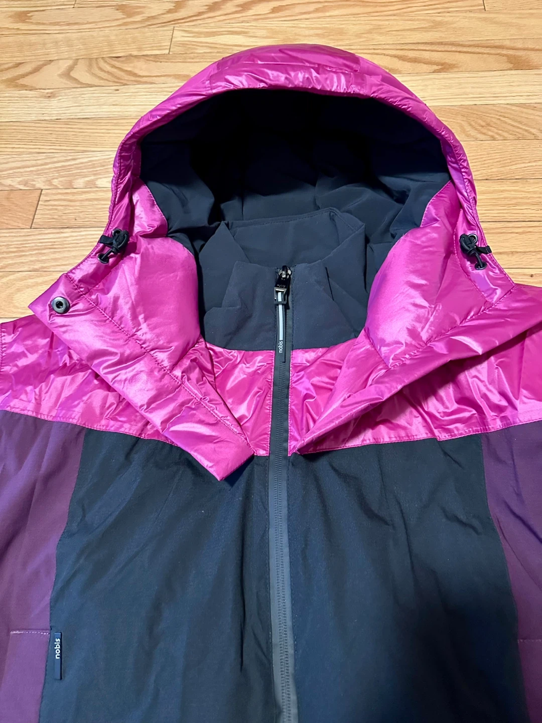 Selling a Nobis Aspen puffer jacket in size XS/TP. The jacket features a stylish colour block design with magenta and black. Perfect for staying warm and fashionable during the colder months!