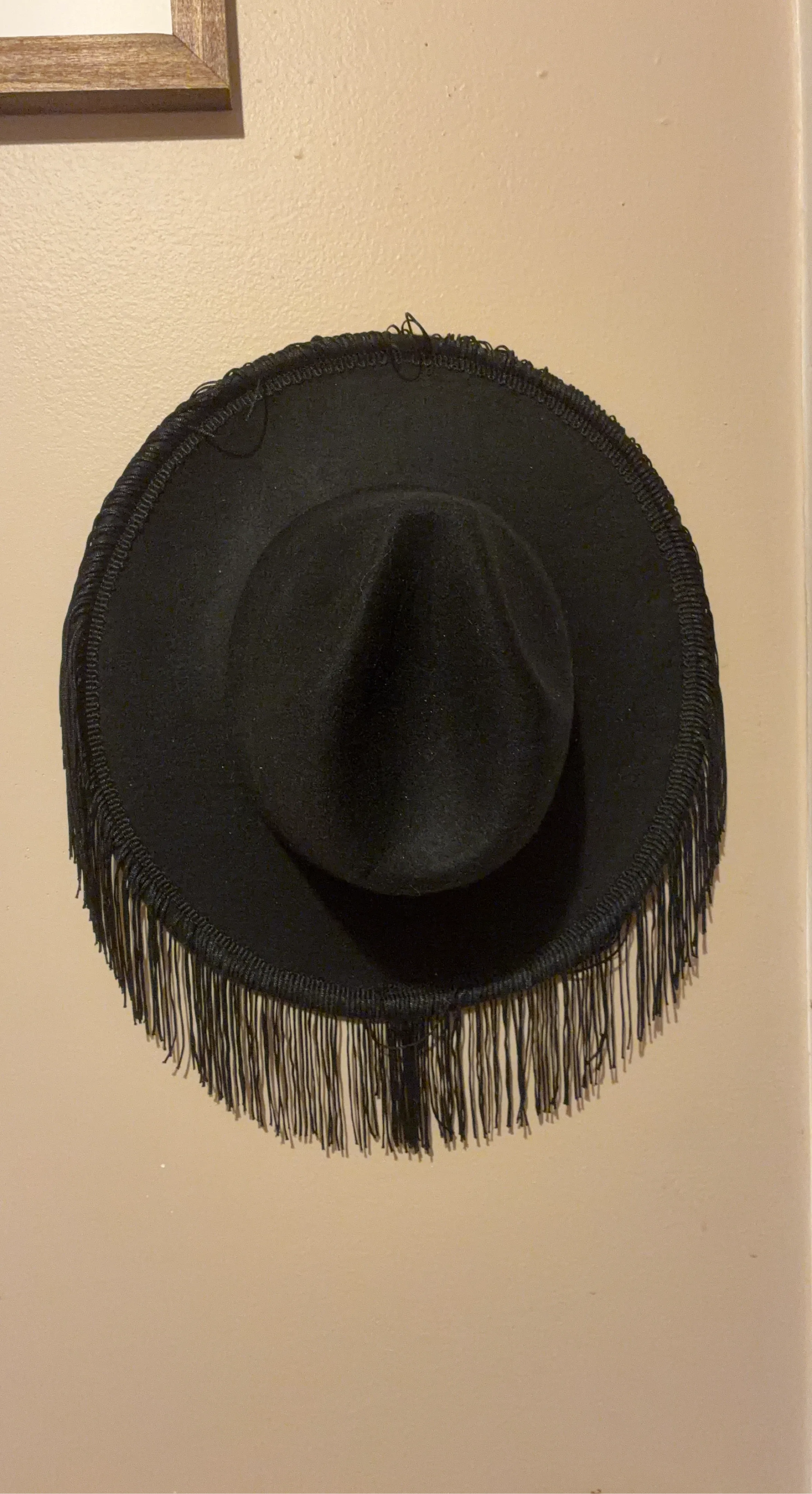 Stylish black fedora hat with a wide brim. Features a unique fringe detail around the edge. Perfect for adding a touch of flair to any outfit! No matter what time it is this amazing hat will always work for you