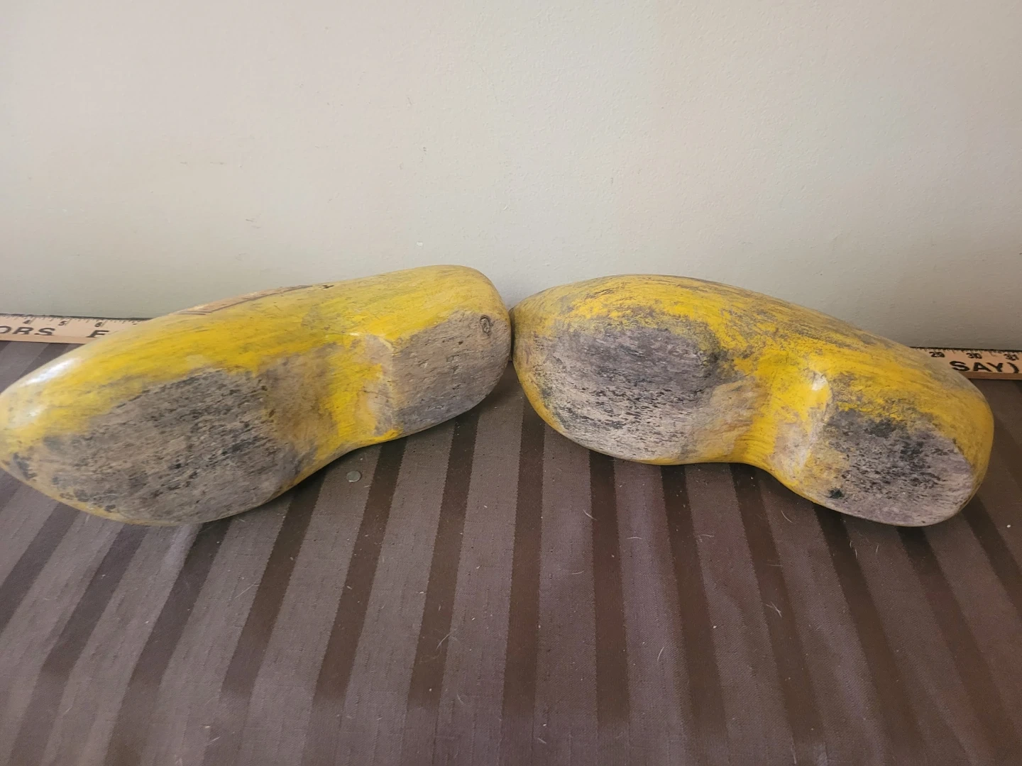 Decorative wooden clogs painted yellow with a traditional pattern. they're hand-painted and would make a charming decor piece. Interior wood is unfinished.