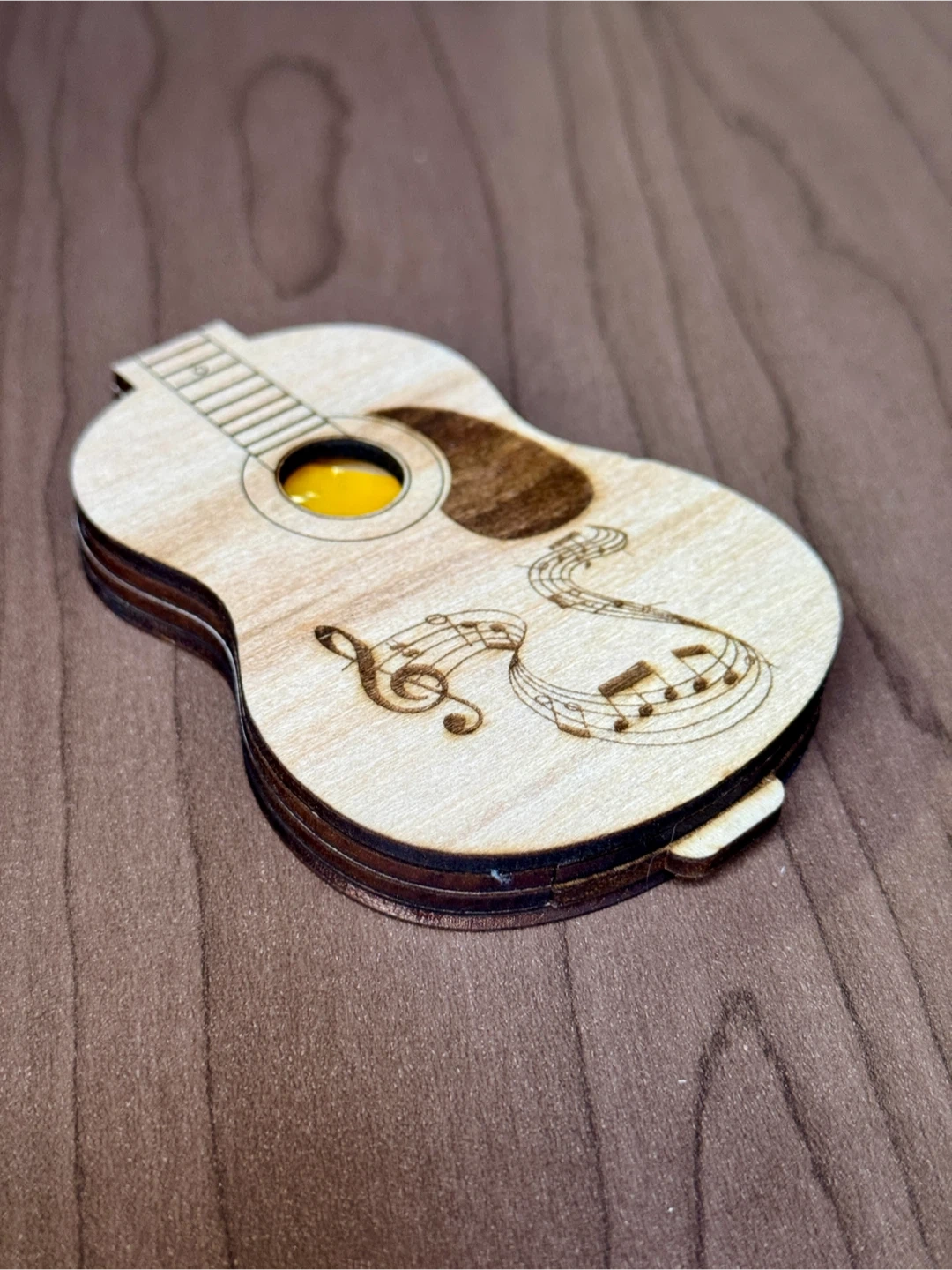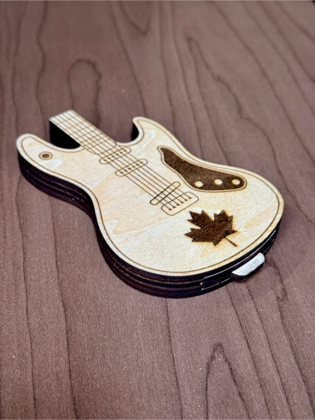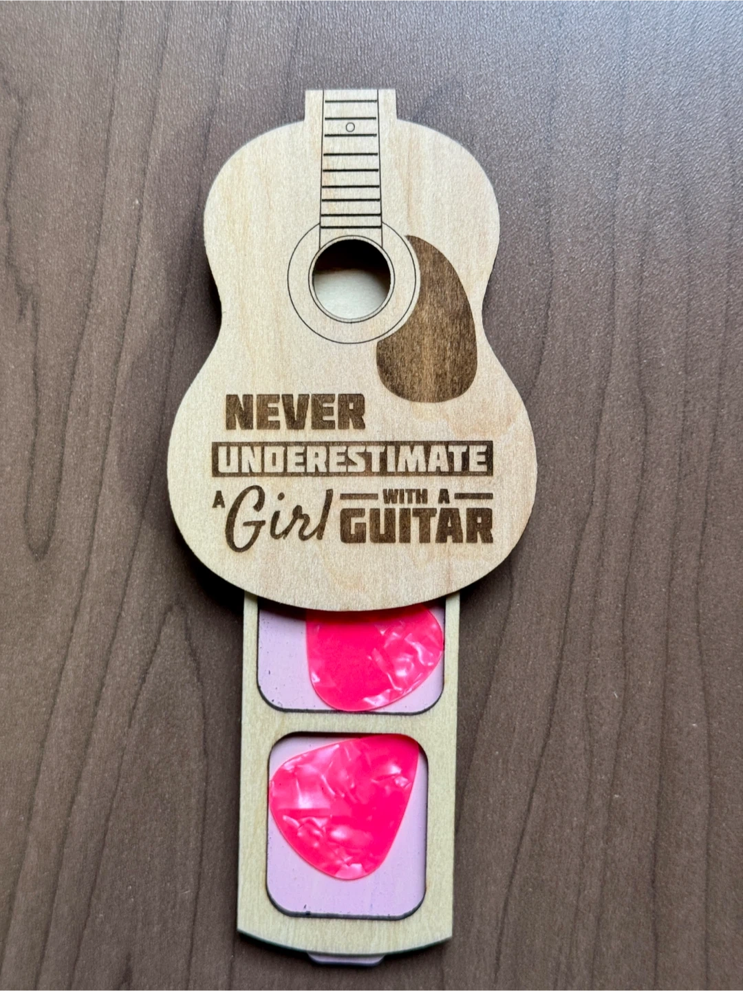 For sale: Made by me, laser cut & engraved guitar pick holders (Acoustic & Electric guitar versions) with MANY different designs and graphics - 40 custom designs currently available and changing all the time. Pocket size and portable. Holds 2-6 picks depending on the thickness of the picks. Made from 4 layers of Basswood.