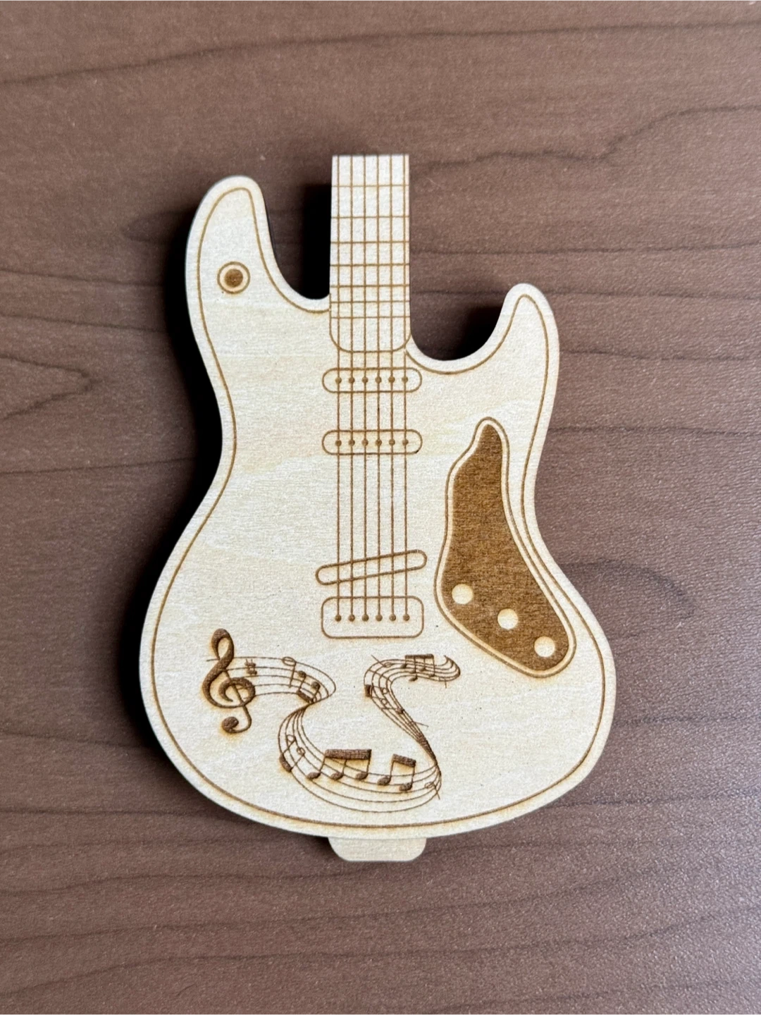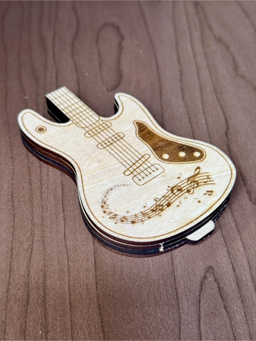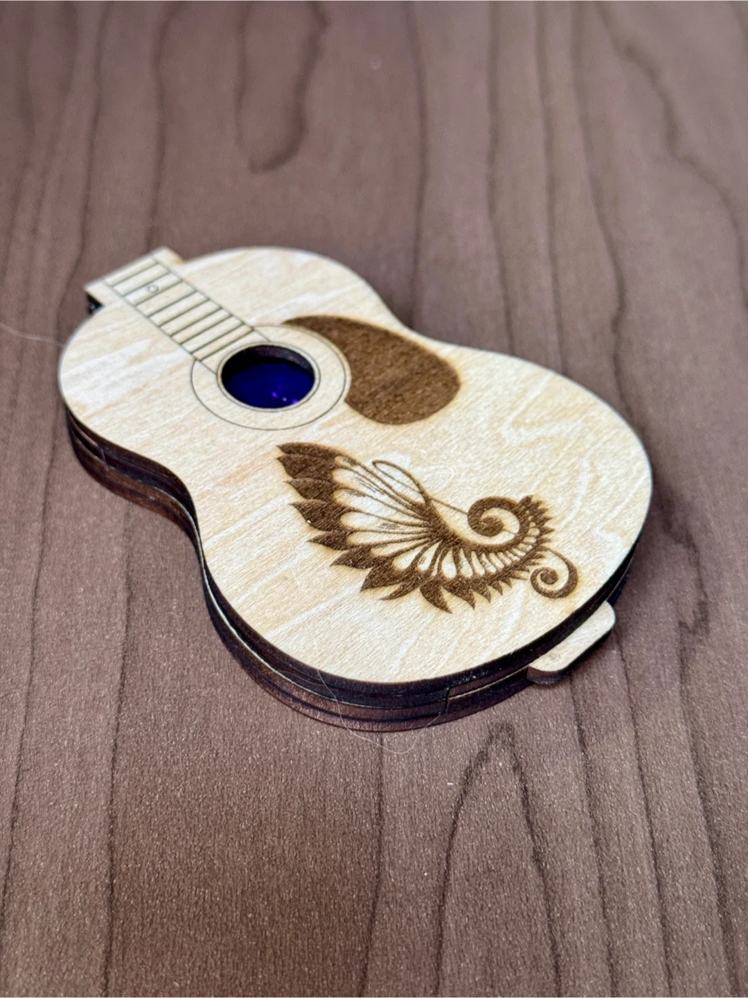For sale: Made by me, laser cut & engraved guitar pick holders (Acoustic & Electric guitar versions) with MANY different designs and graphics - 40 custom designs currently available and changing all the time. Pocket size and portable. Holds 2-6 picks depending on the thickness of the picks. Made from 4 layers of Basswood.