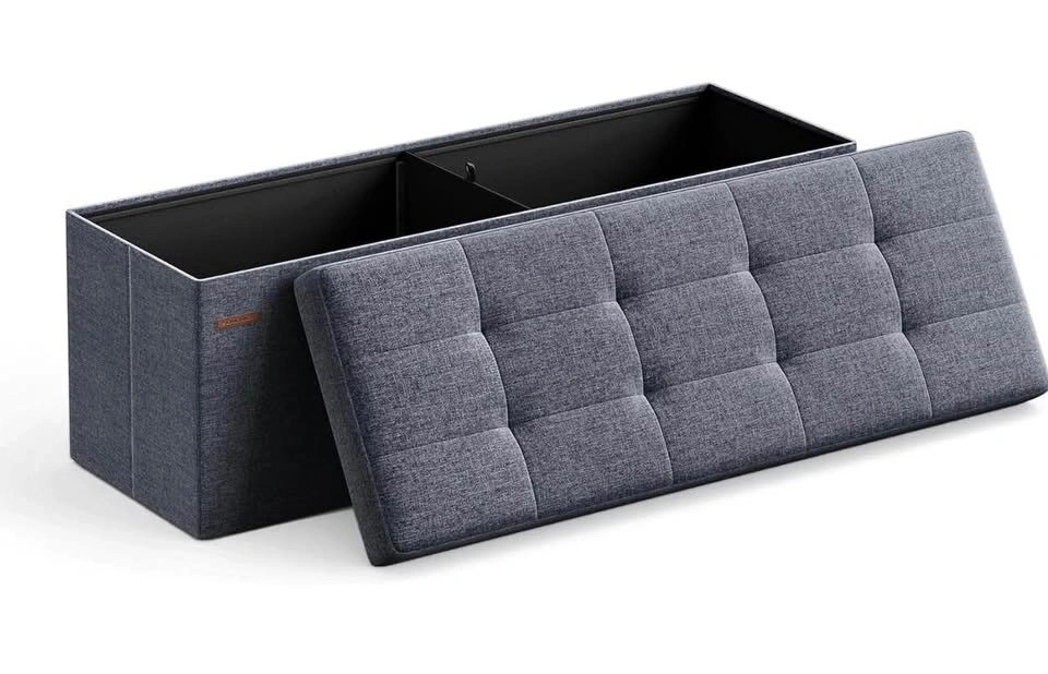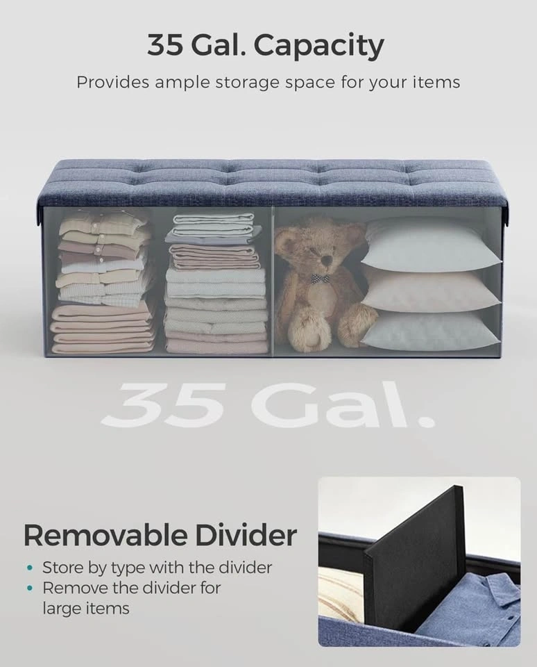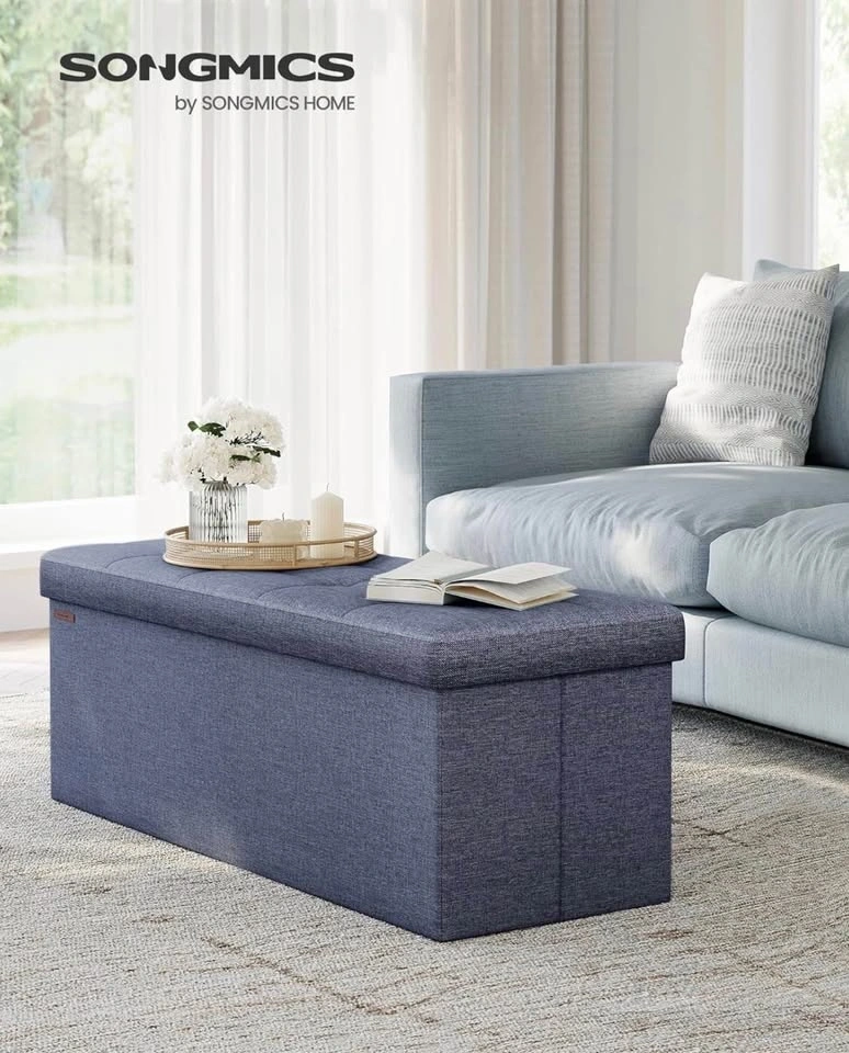 This brand new 110 cm folding ottoman bench in misty blue offers versatile use as a footrest, extra seating, or a storage unit. The ottoman has a tufted top and durable construction. When not in use, it can be easily folded away. It features a removable divider to help keep your items organized.